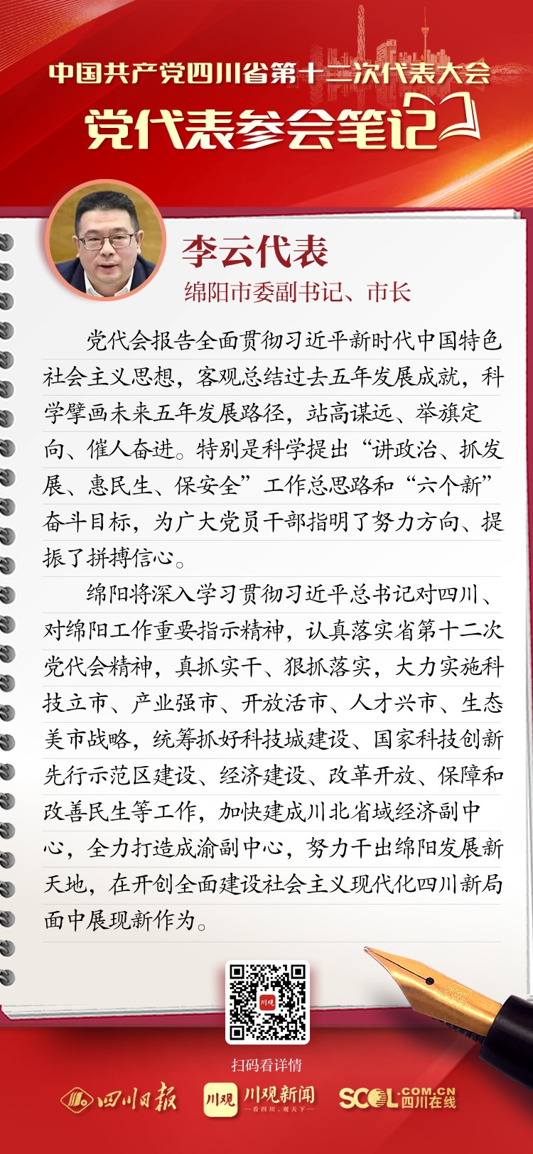 来自全省各地的党代表们汇聚一堂,聆听王晓晖代表中共四川省第十一届委员会向大会作的报告。党代表们有很多所感所思、所盼所谋。四川在线在党代会期间推出“党代表参会笔记”栏目,让我们一起来看看,党代表们“记”下了哪些重点和关注点。