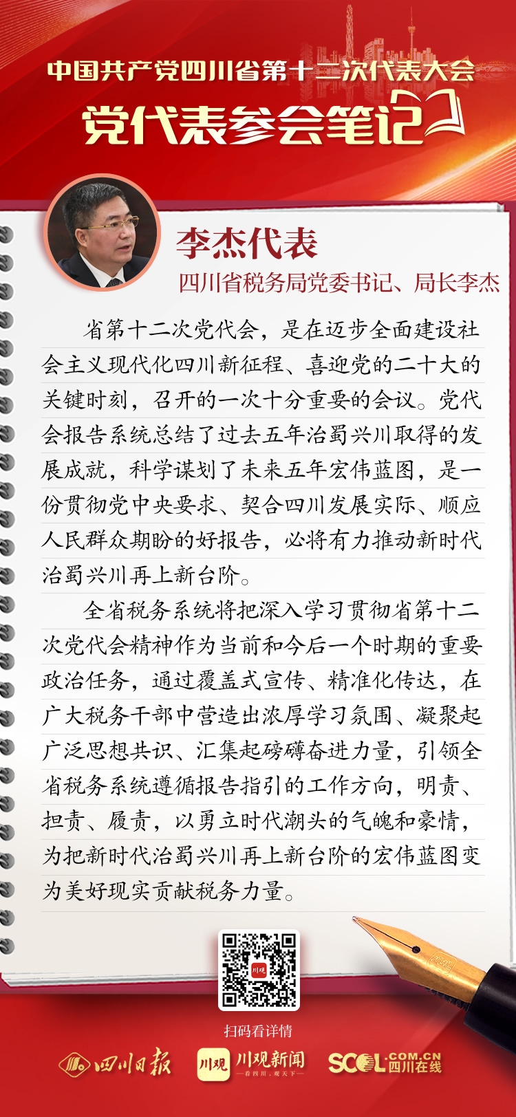 来自全省各地的党代表们汇聚一堂,聆听王晓晖代表中共四川省第十一届委员会向大会作的报告。党代表们有很多所感所思、所盼所谋。四川在线在党代会期间推出“党代表参会笔记”栏目,让我们一起来看看,党代表们“记”下了哪些重点和关注点。