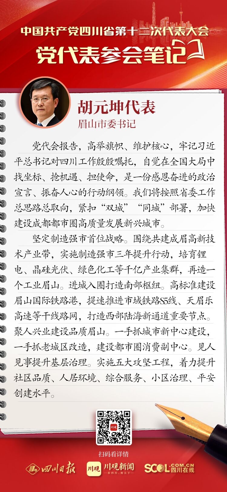 来自全省各地的党代表们汇聚一堂,聆听王晓晖代表中共四川省第十一届委员会向大会作的报告。党代表们有很多所感所思、所盼所谋。四川在线在党代会期间推出“党代表参会笔记”栏目,让我们一起来看看,党代表们“记”下了哪些重点和关注点。