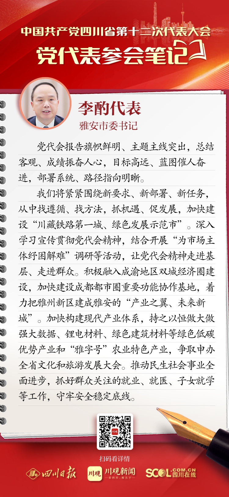 来自全省各地的党代表们汇聚一堂,聆听王晓晖代表中共四川省第十一届委员会向大会作的报告。党代表们有很多所感所思、所盼所谋。四川在线在党代会期间推出“党代表参会笔记”栏目,让我们一起来看看,党代表们“记”下了哪些重点和关注点。