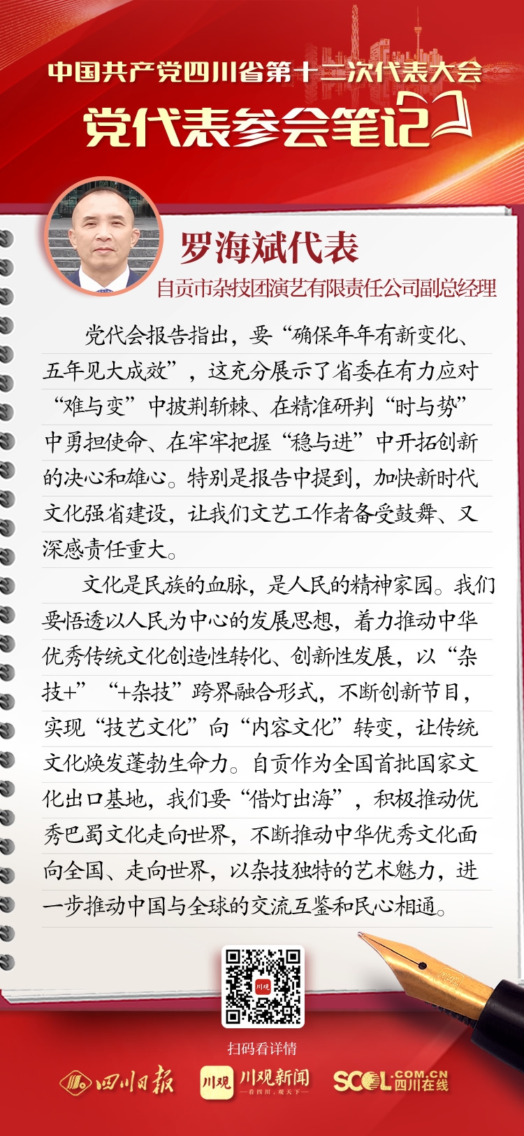 来自全省各地的党代表们汇聚一堂,聆听王晓晖代表中共四川省第十一届委员会向大会作的报告。党代表们有很多所感所思、所盼所谋。四川在线在党代会期间推出“党代表参会笔记”栏目,让我们一起来看看,党代表们“记”下了哪些重点和关注点。