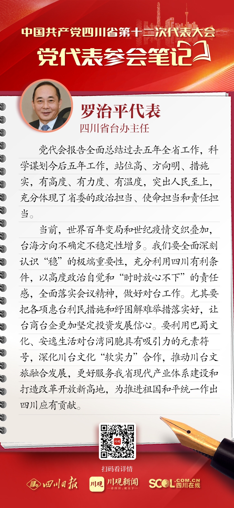 来自全省各地的党代表们汇聚一堂,聆听王晓晖代表中共四川省第十一届委员会向大会作的报告。党代表们有很多所感所思、所盼所谋。四川在线在党代会期间推出“党代表参会笔记”栏目,让我们一起来看看,党代表们“记”下了哪些重点和关注点。