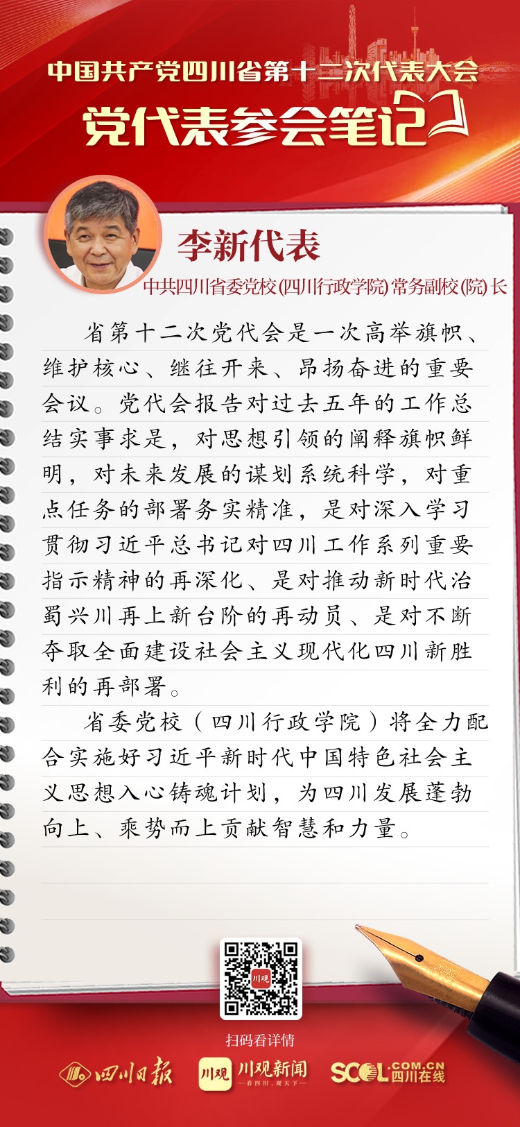 来自全省各地的党代表们汇聚一堂,聆听王晓晖代表中共四川省第十一届委员会向大会作的报告。党代表们有很多所感所思、所盼所谋。四川在线在党代会期间推出“党代表参会笔记”栏目,让我们一起来看看,党代表们“记”下了哪些重点和关注点。