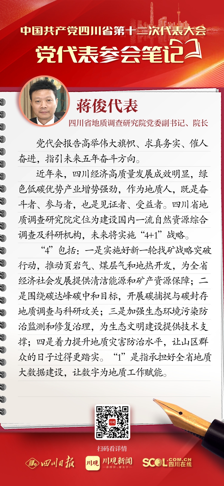 近年来,四川经济高质量发展成效明显,绿色低碳优势产业增势强劲,作为地质人,既是奋斗者、参与者,也是见证者、受益者。四川省地质调查研究院定位为建设国内一流自然资源综合调查及科研机构,未来将实施“4+1”战略。