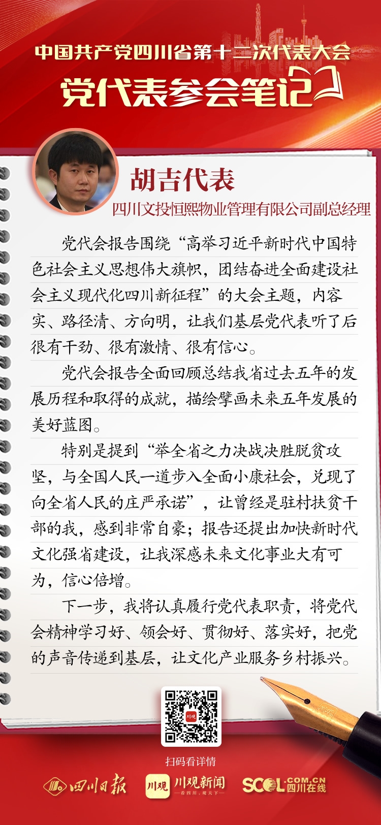 来自全省各地的党代表们汇聚一堂,聆听王晓晖代表中共四川省第十一届委员会向大会作的报告。党代表们有很多所感所思、所盼所谋。四川在线在党代会期间推出“党代表参会笔记”栏目,让我们一起来看看,党代表们“记”下了哪些重点和关注点。