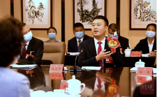 5月27日,省第十二次党代会内江代表团分组讨论现场,林昆代表发言后展示新开发的布袋木偶伴手礼。