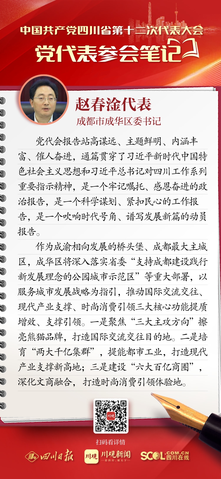来自全省各地的党代表们汇聚一堂,聆听王晓晖代表中共四川省第十一届委员会向大会作的报告。党代表们有很多所感所思、所盼所谋。四川在线在党代会期间推出“党代表参会笔记”栏目,让我们一起来看看,党代表们“记”下了哪些重点和关注点。