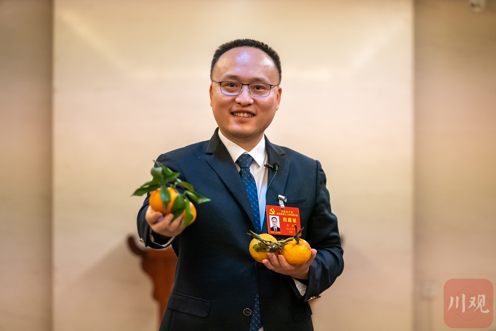 5月27日,在眉山代表团讨论现场,眉山市青神县高台镇党委副书记、镇长徐俊代表在发完言之后,突然转身俯下,将自己座位背后准备好的10公斤柑橘拎出来,热情地向会场内每一位党代表送上。