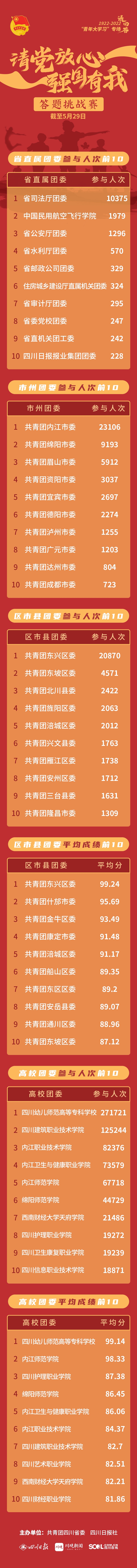 由共青团四川省委联合四川日报社共同举办的“请党放心·强国有我”答题挑战赛(“青年大学习”专场),5月份月度各项数据和排名出炉。相较于5月中旬发布的第一阶段榜单,本次榜单有不少市、县、高校团委首次进入前三位。