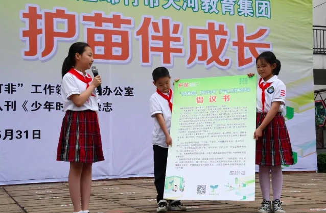 本次活动与绵竹市天河教育集团的“六一”庆典相结合,以“书香满校园,护苗伴成长”为主题。绵竹市天河小学法治副校长戴汶为同学们宣讲了《未成年人保护法》,学生代表邓嫦熙向大家发出倡议:“坚决抵制非法出版物及有害信息,自觉养成绿色阅读、文明上网的习惯,积极举报不健康出版物及网络有害信息。”