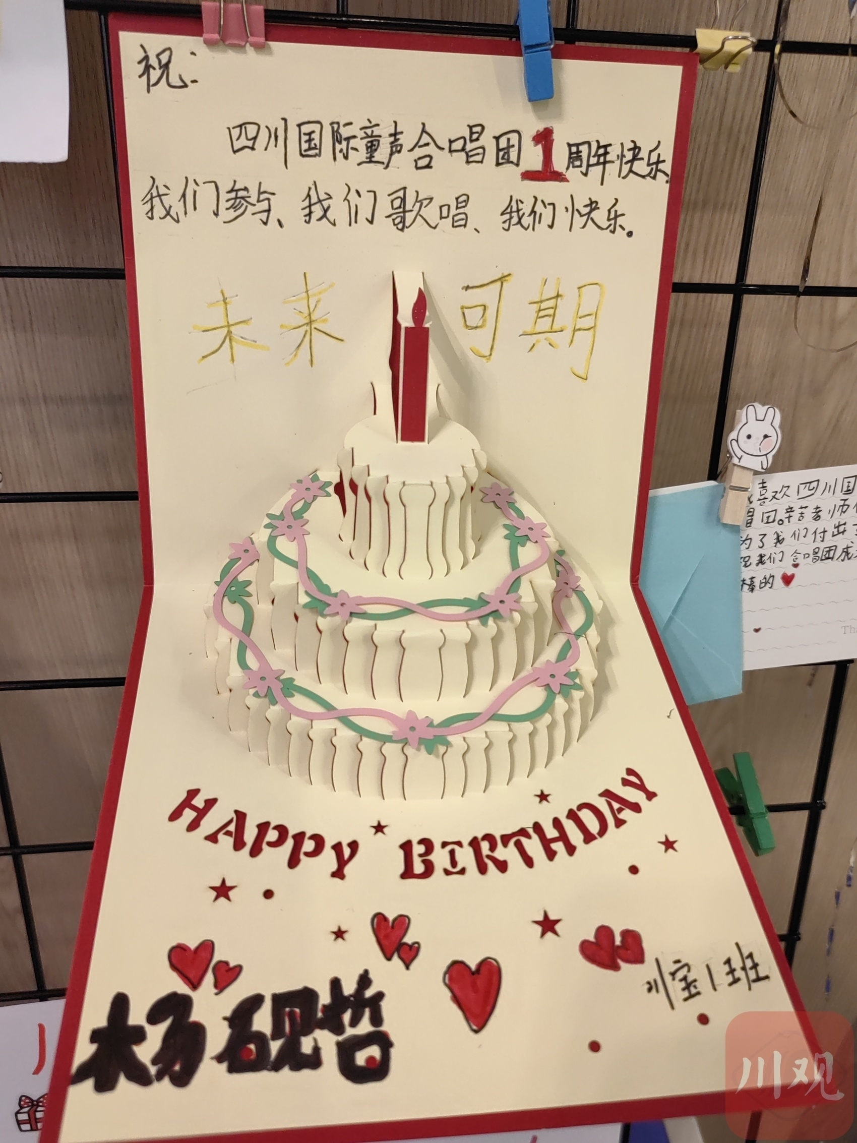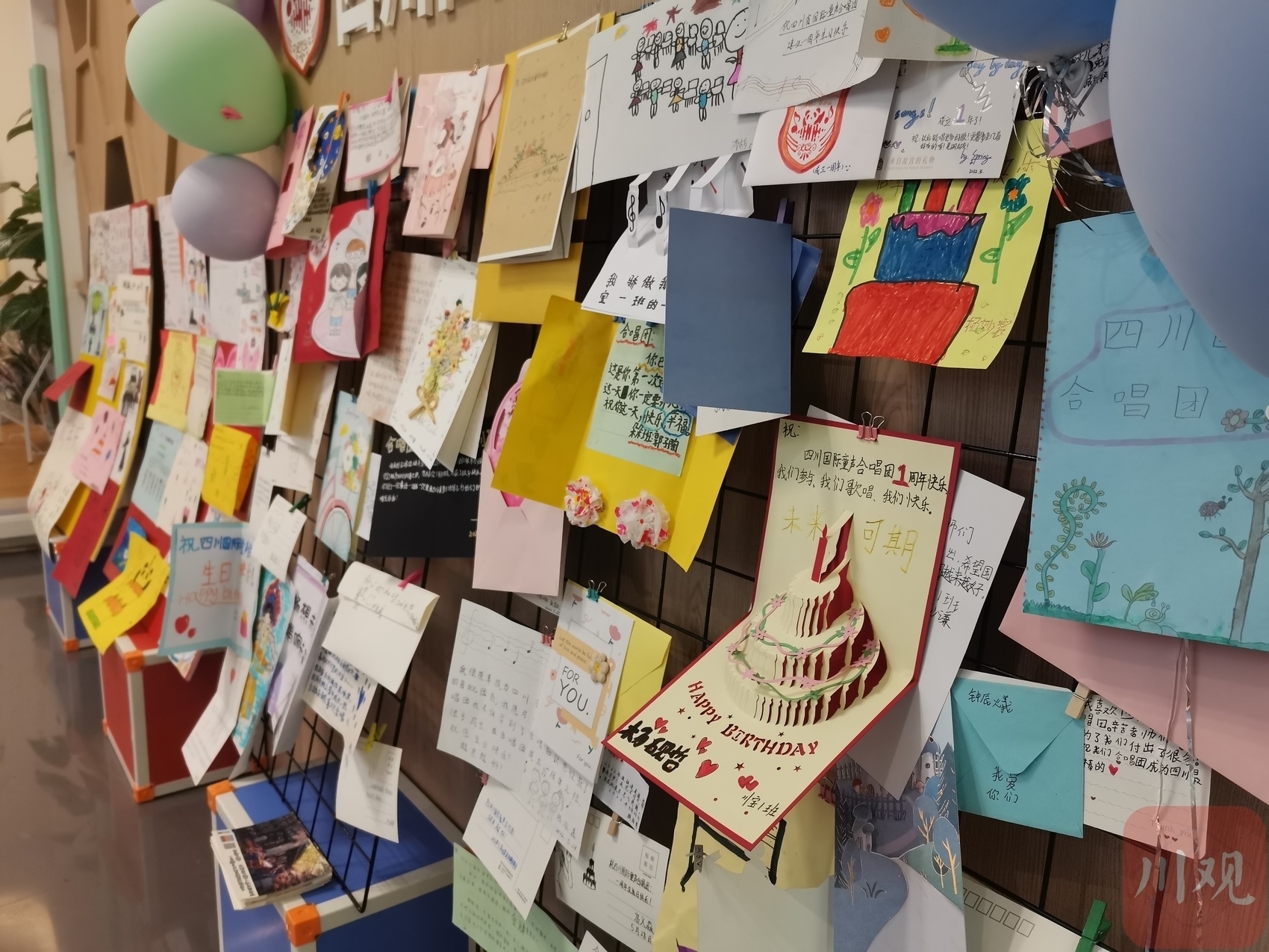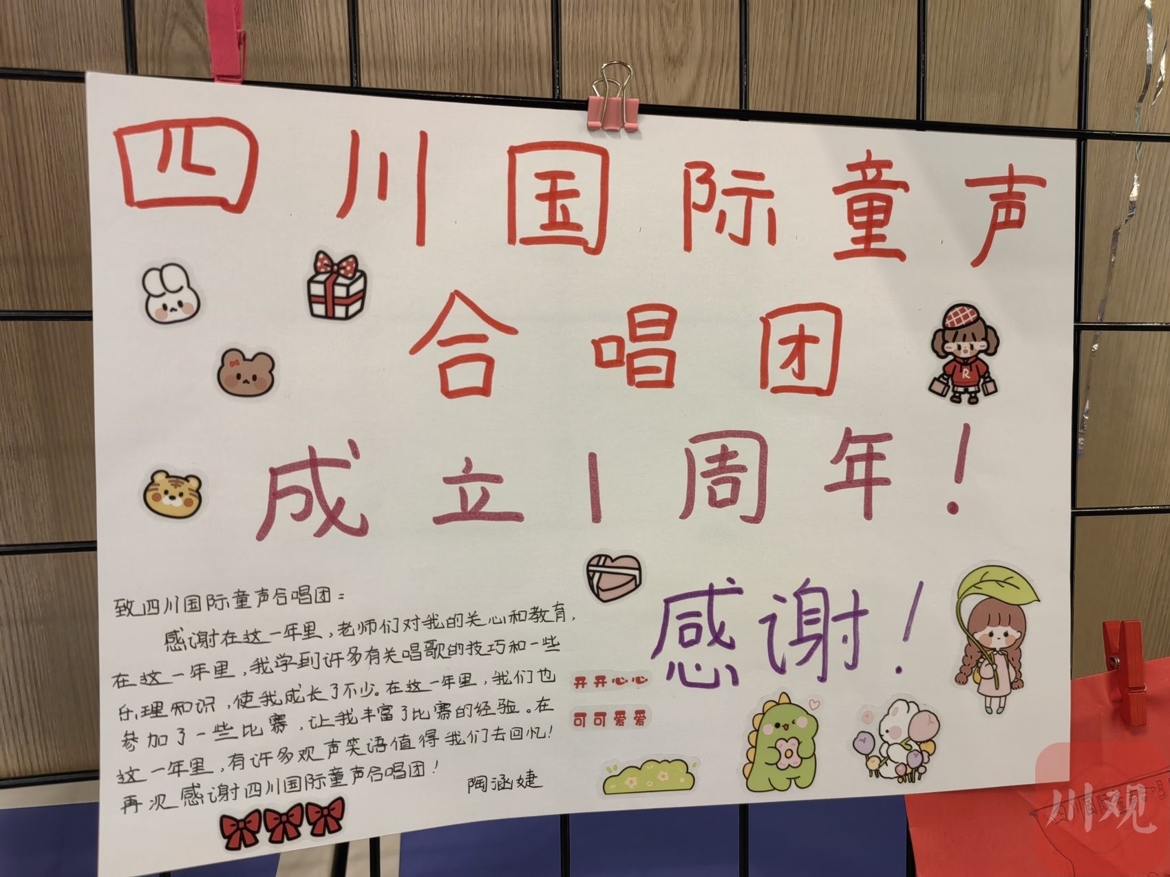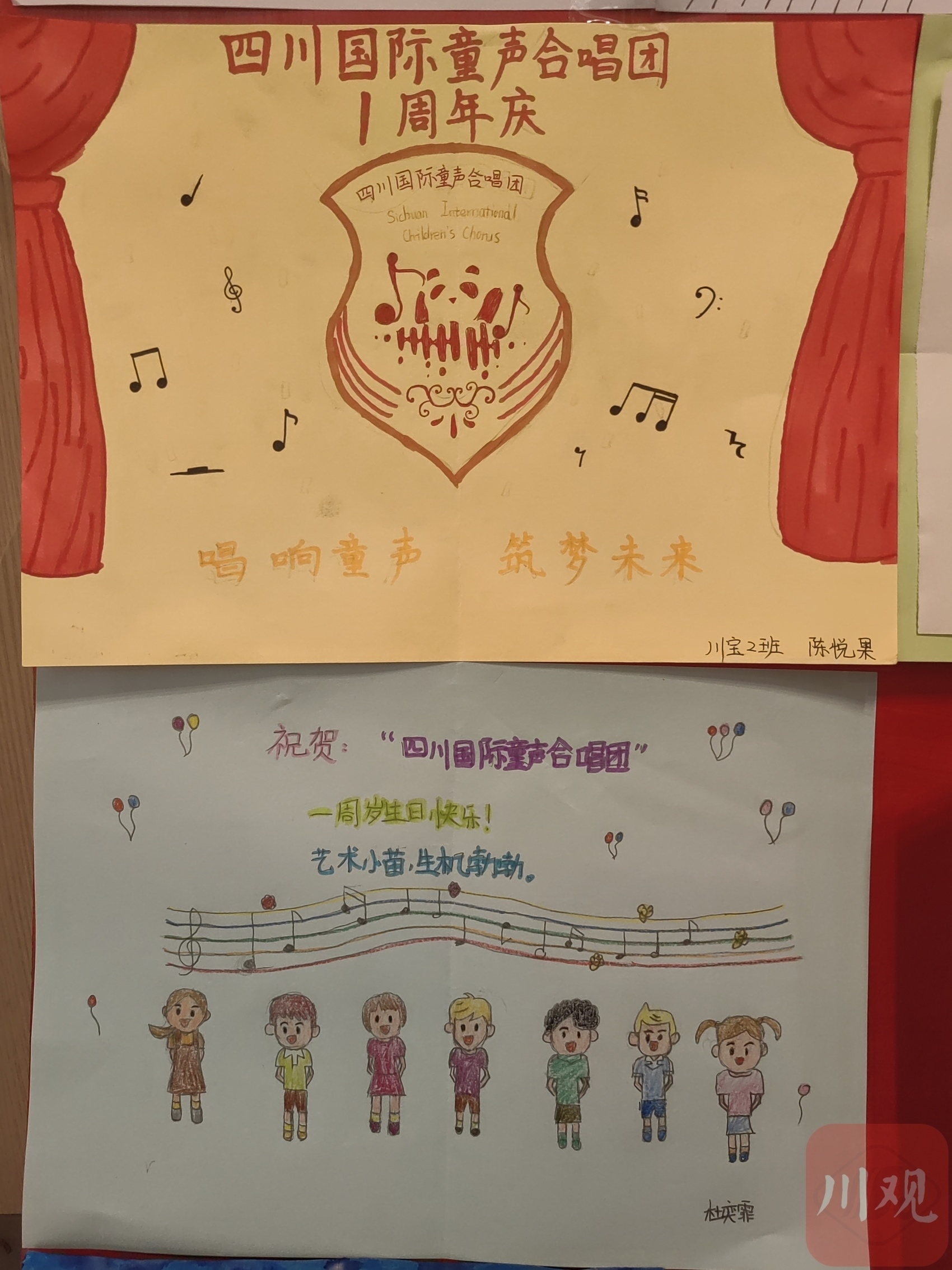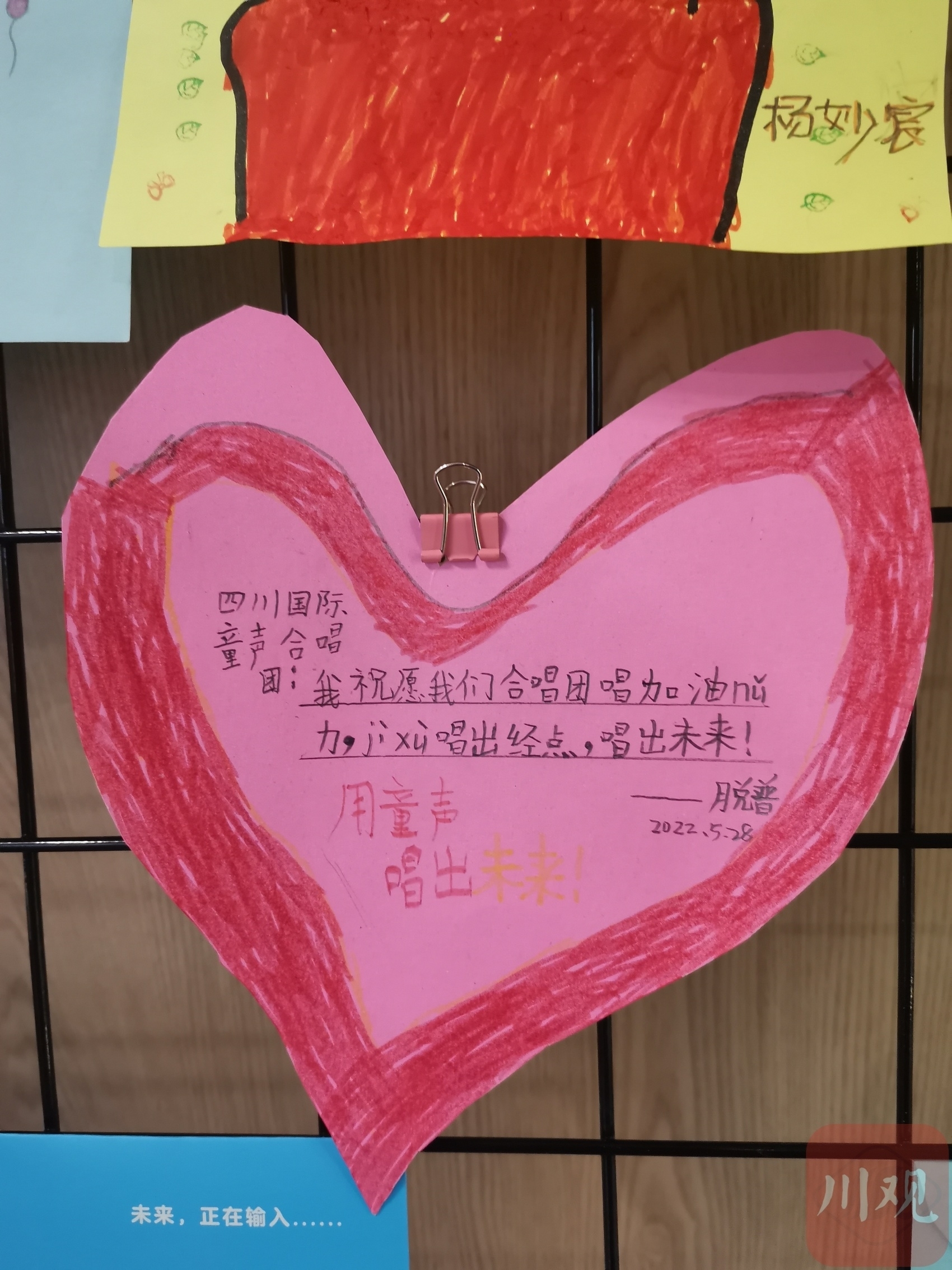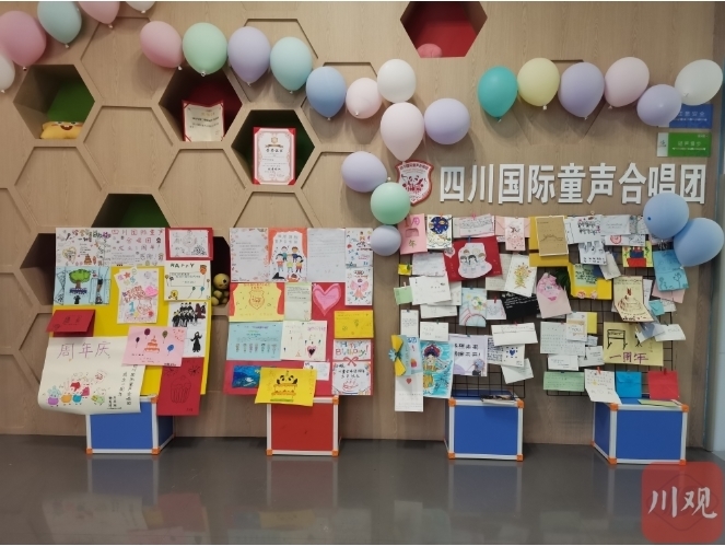 “感谢半年前的相识,让我一步步走进音乐的殿堂;感谢老师们的悉心教导,让我在乐谱中徜徉。”“这一年我学到了很多的唱歌技巧和乐理知识,认识了很多朋友,还有很多的欢声笑语值得回忆,谢谢四川国际童声合唱团。”……5月29日,合唱团入口处的展示墙上,贴满了五颜六色的手绘卡片,孩子们用这种方式向合唱团“告白”。