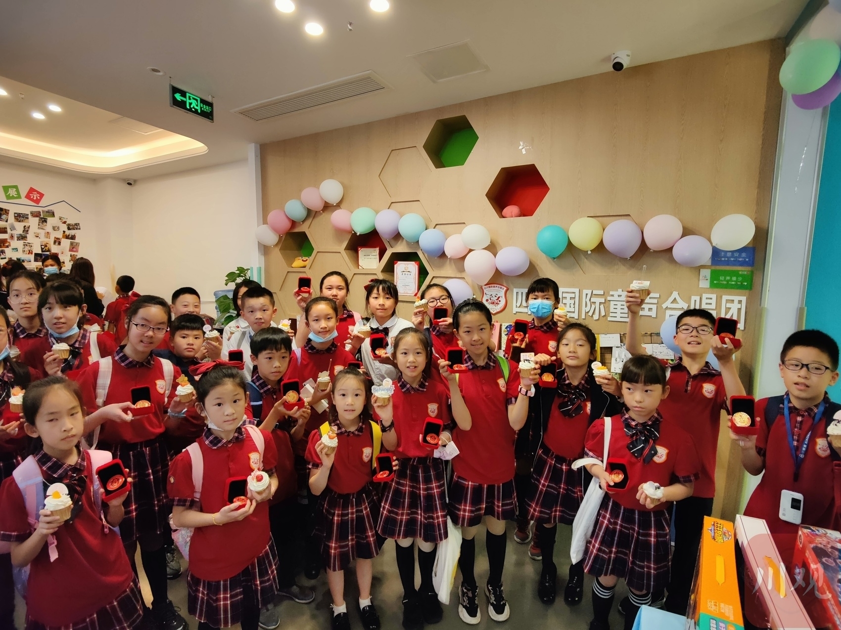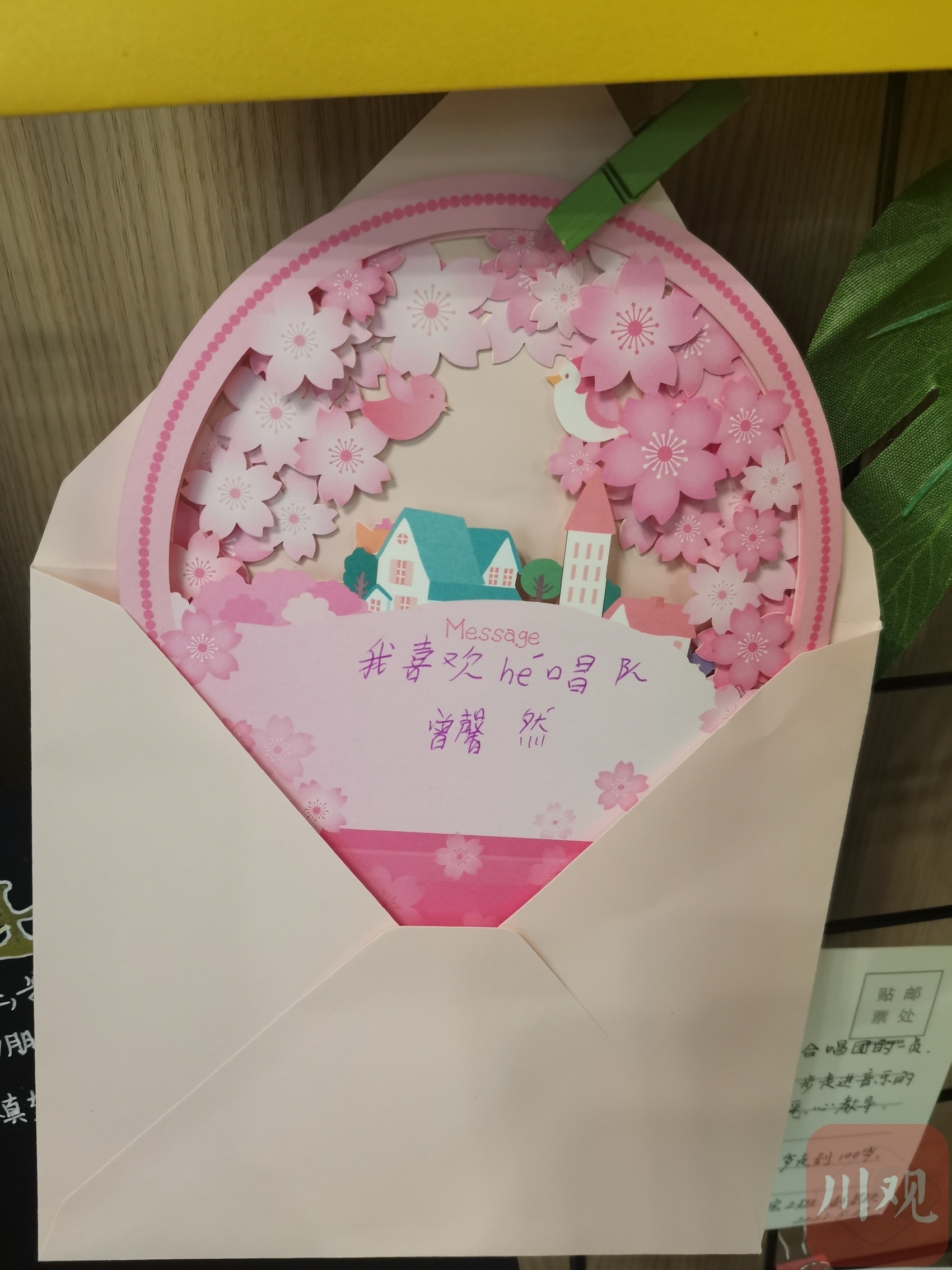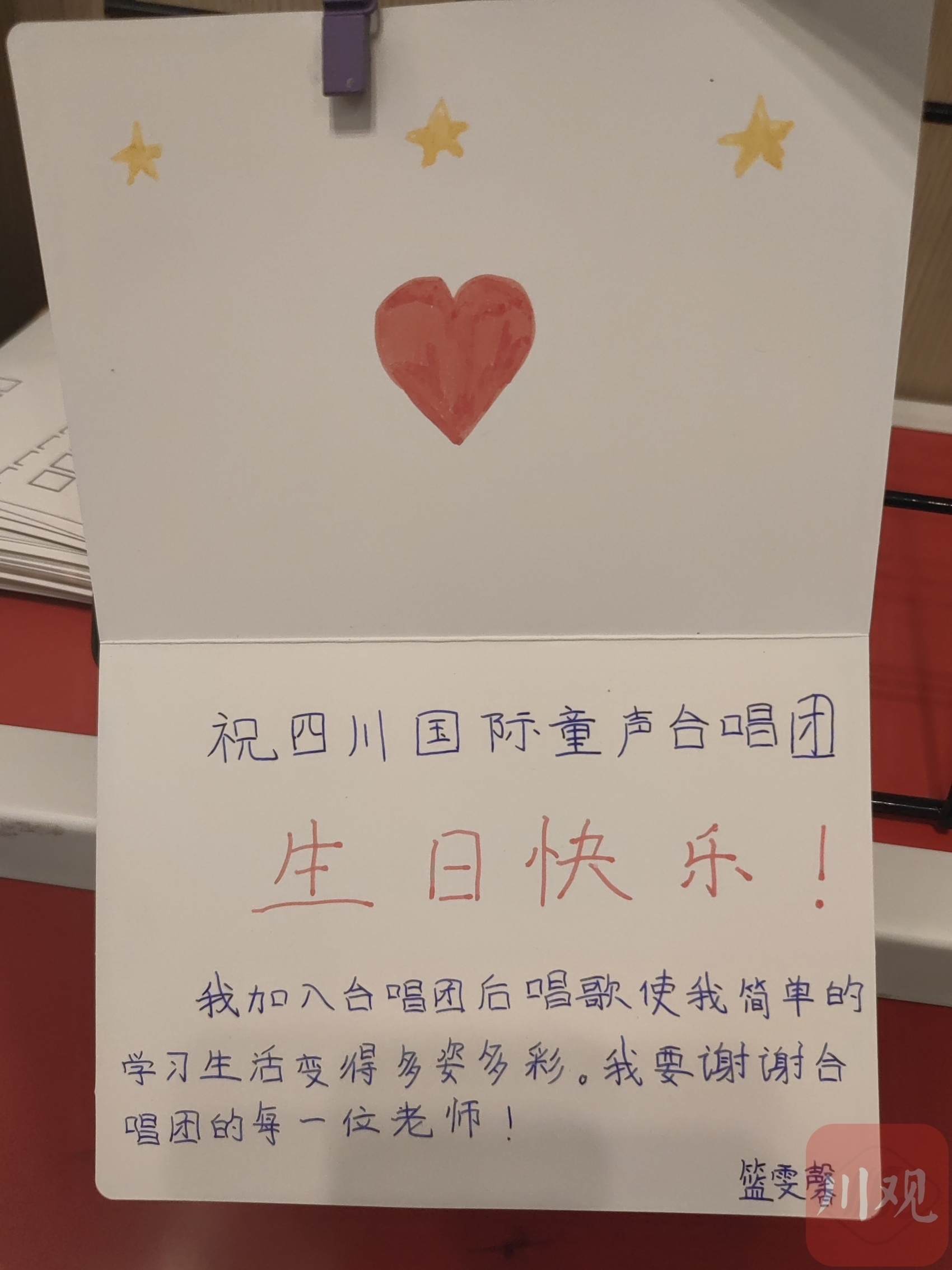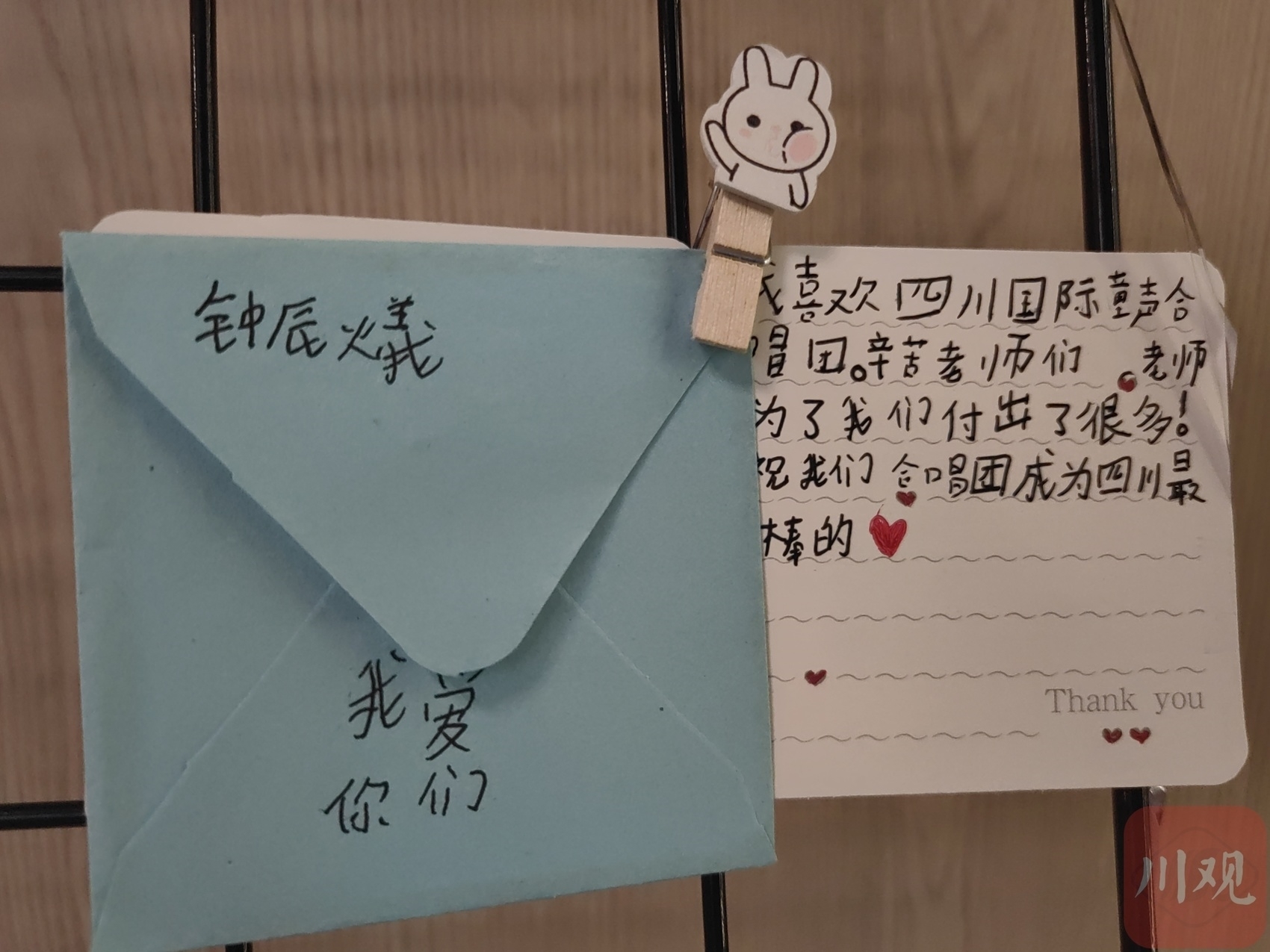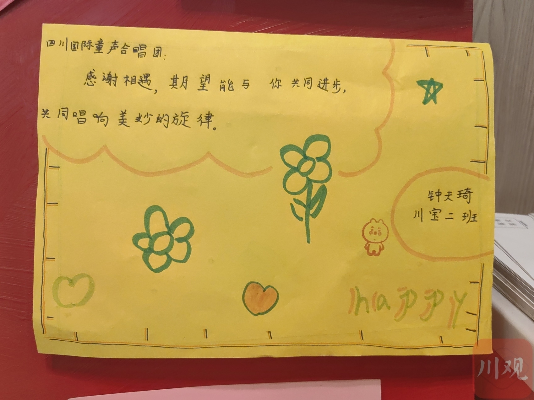 “感谢半年前的相识,让我一步步走进音乐的殿堂;感谢老师们的悉心教导,让我在乐谱中徜徉。”“这一年我学到了很多的唱歌技巧和乐理知识,认识了很多朋友,还有很多的欢声笑语值得回忆,谢谢四川国际童声合唱团。”……5月29日,合唱团入口处的展示墙上,贴满了五颜六色的手绘卡片,孩子们用这种方式向合唱团“告白”。