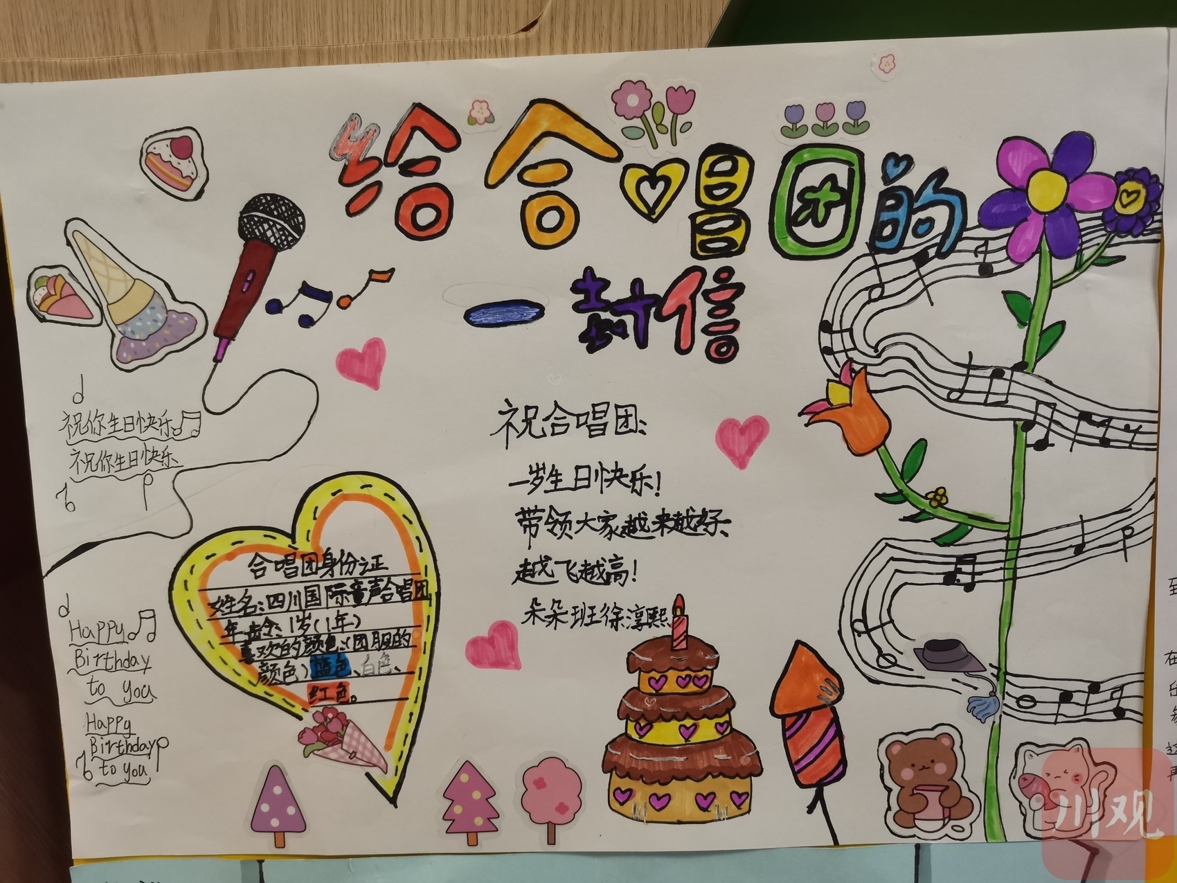 今天是“六一”国际儿童节,也是四川国际童声合唱团成立一周年的日子,从正式成立到小有成绩,合唱团经历了美好且难忘的一年。周末排练时,孩子们在自己亲手绘制的一张张卡片上,用稚嫩的语句和画笔,向最爱的合唱团表达着最诚挚的祝福。