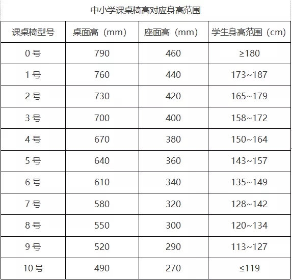 在选择可调节课桌椅时,家长可根据孩子身高,按照中小学生课桌椅的身高范围表找到适合孩子的桌面高和座面高(如插图);而没有可调节桌椅的家庭,可以参考孩子坐上去大腿和小腿要垂直,背要挺直,上臂下垂,手肘要在桌面以下3—4厘米。如果桌子过高了,就要尽可能使用高一点的椅子,之后要在脚下垫上脚垫,保持大腿和小腿垂直。同理,当桌子或椅子过矮的时候,要将桌子或椅子垫高。