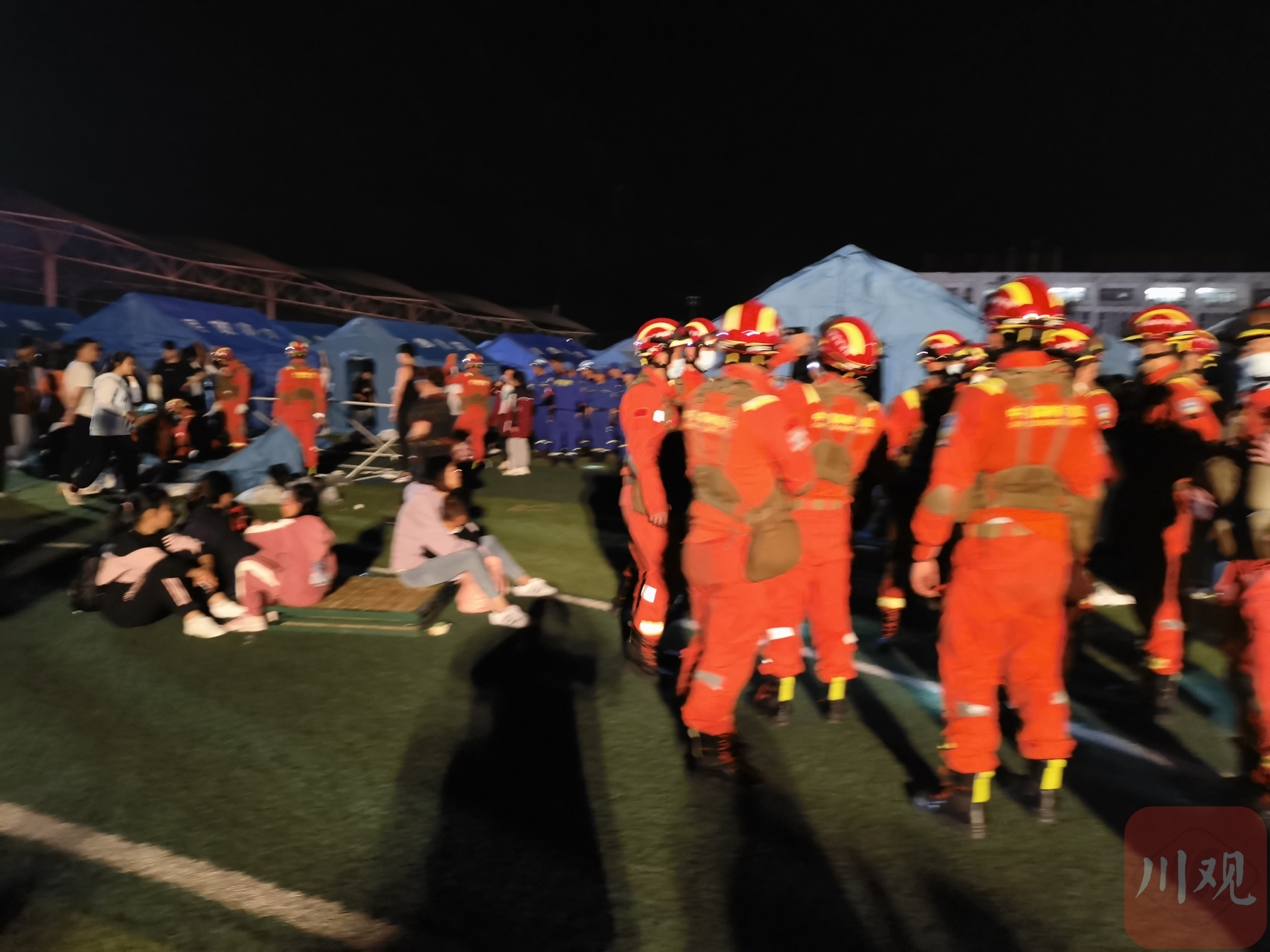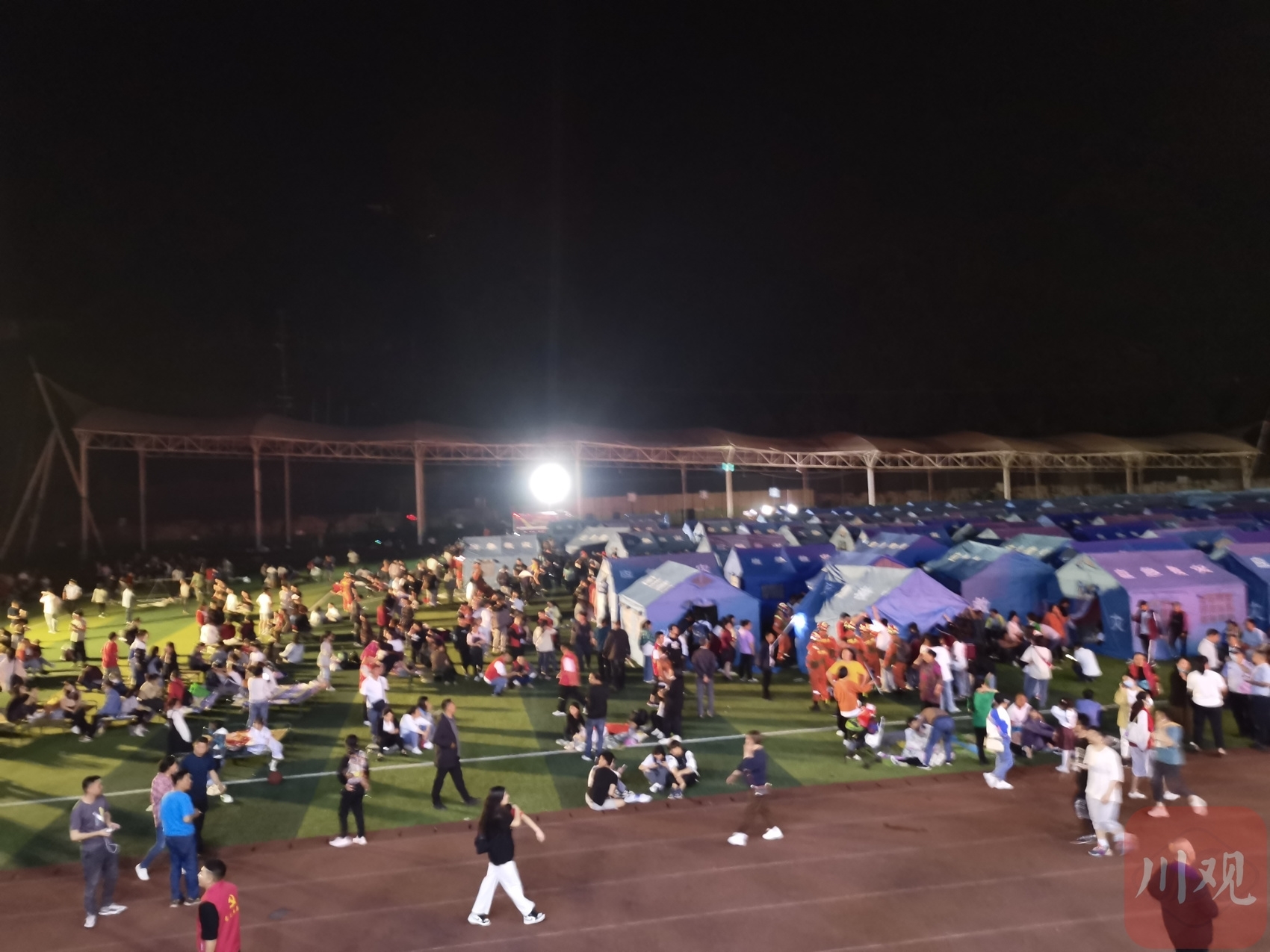 6月1日23时30分,宝兴中学安置点,距离地震已经过去6个多小时,宽敞的操场中央,一顶顶蓝色帐篷在夜灯下格外显眼。一车车棉被、生活物资陆续搬进校区,门口处两台电视播放着节目,一些老百姓围在电视机前聊天。