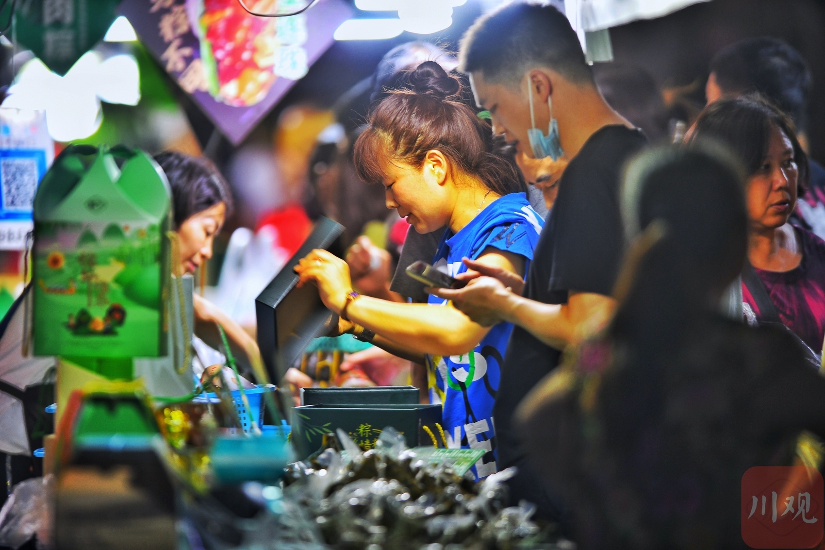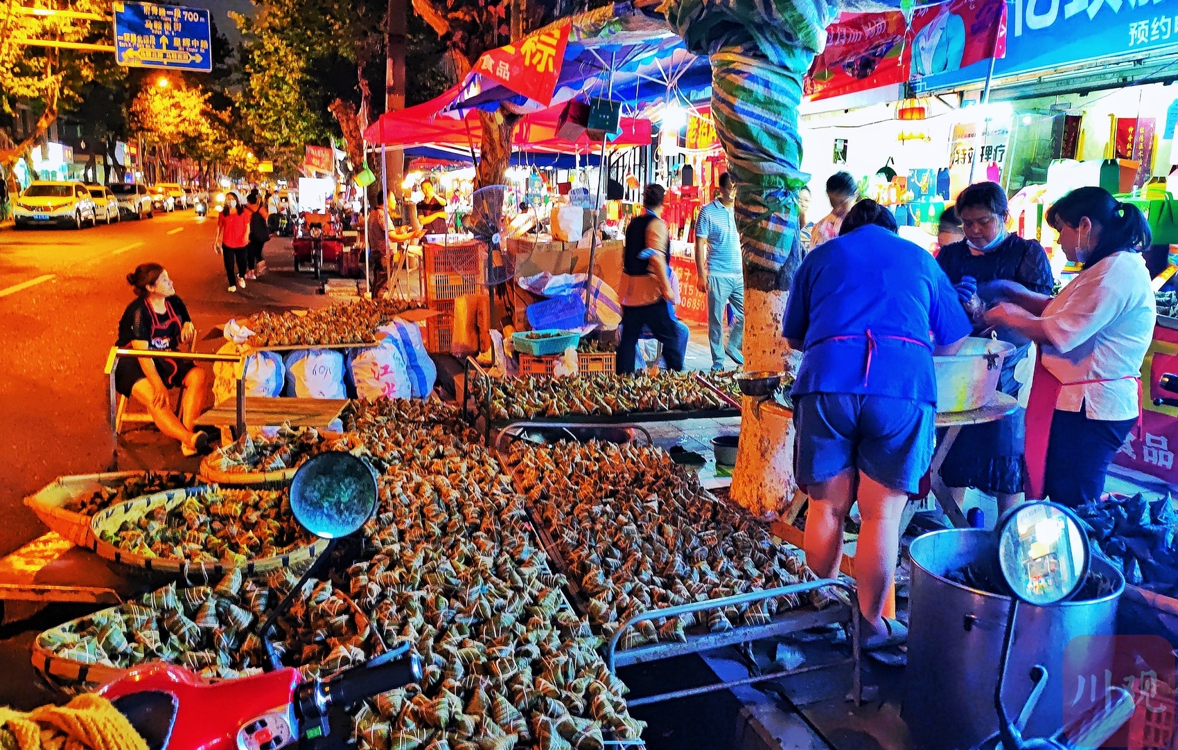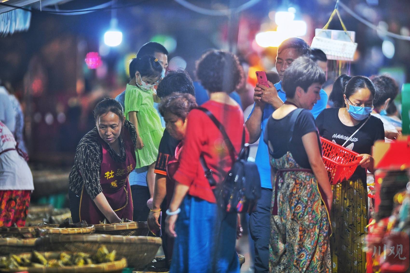 夏夜微风,灯影婆娑,熙熙攘攘的小街上弥漫着淡淡的粽香,选购粽子的市民络绎不绝,这就是烟火气十足的成都市井生活。