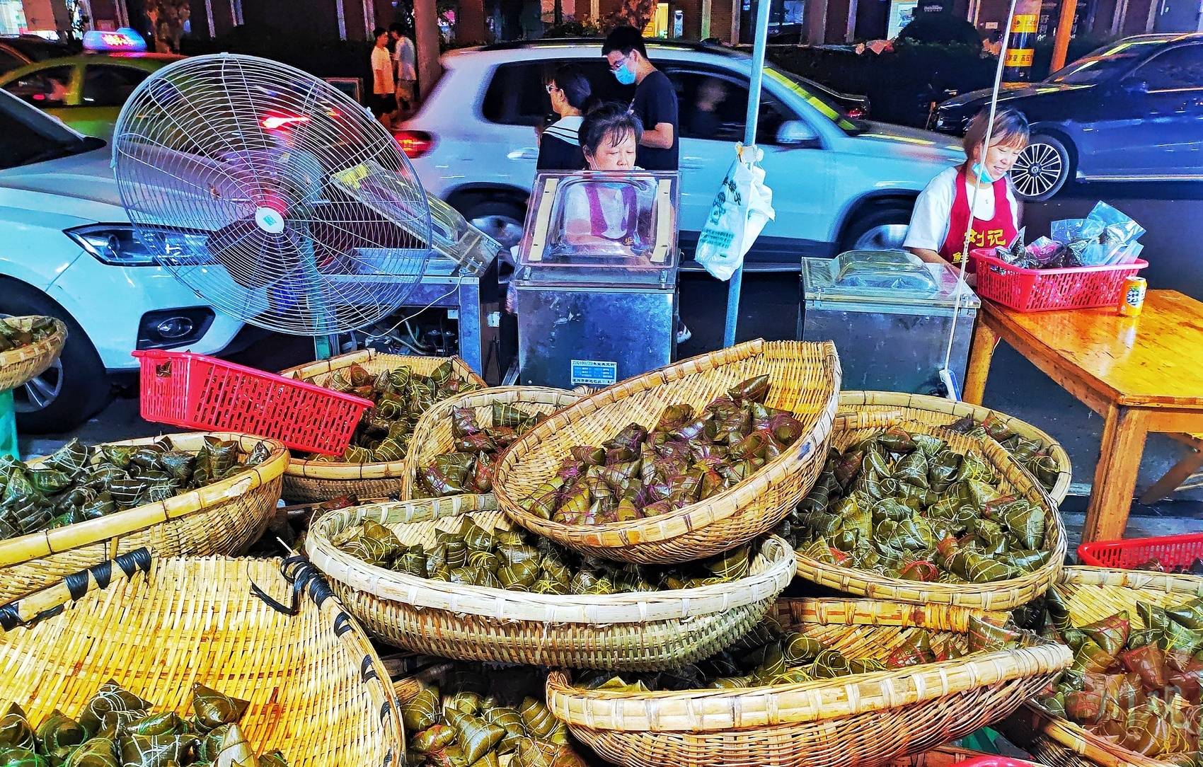 6月1日晚,入夜的马鞍东路灯火通明。店主和工人们挽起袖子包粽子,忙个不停。现场包、现场蒸、现场抽真空、现场打包发货,一条龙的端午粽子服务能满足食客们对粽子的一切需求。