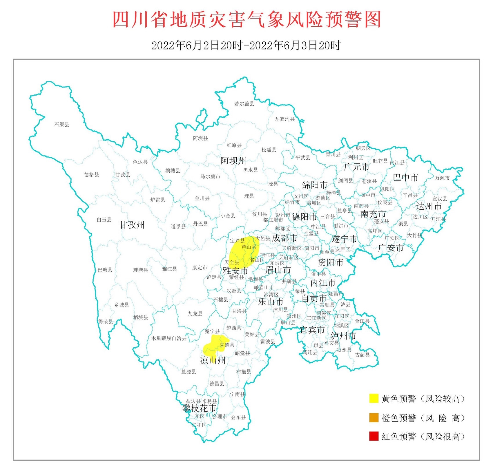 6月2日17时,四川省地质灾害指挥部办公室发布地质灾害气象风险黄色预警,涉及雅安、成都、凉山3市(州)10个县(市、区)。