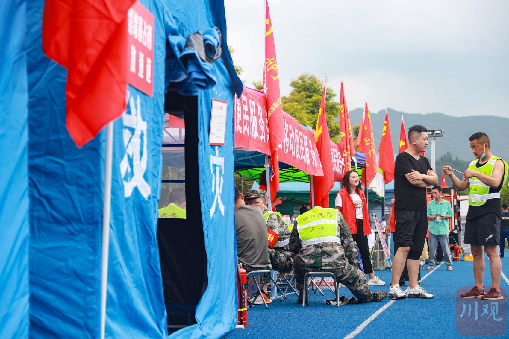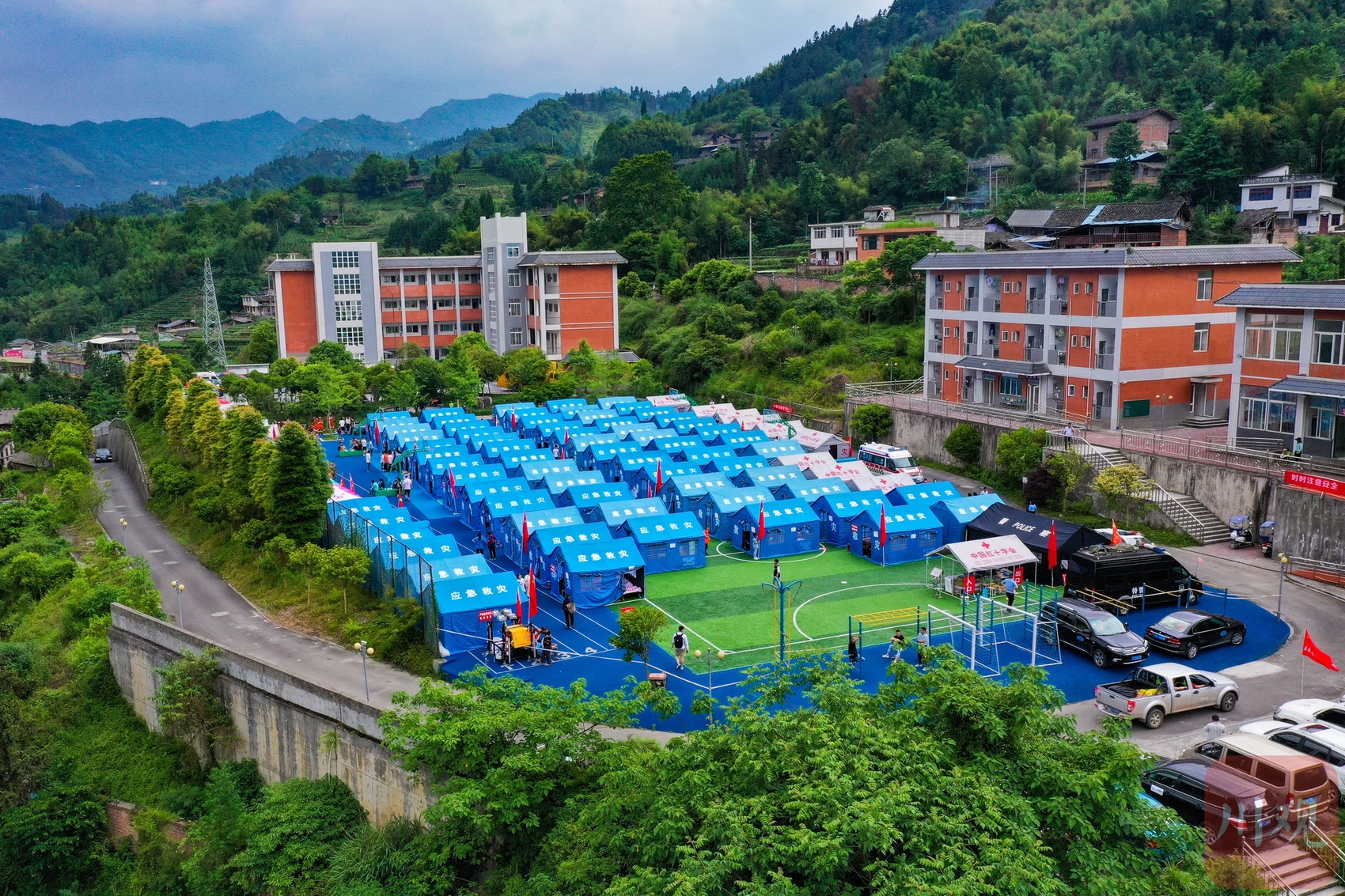 6月2日,临近中午。芦山县太平中学安置点有了浓浓的生活氛围,数排帐篷整齐地搭建在操场上,青年之家、社会组织和志愿服务站点已经建起。
