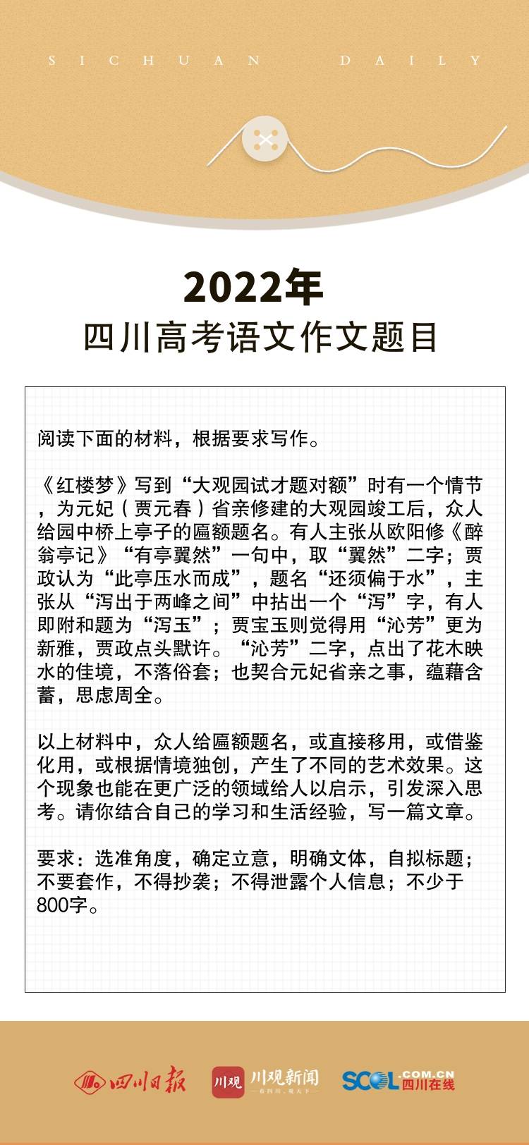 2022年四川高考语文作文题,从过去几年的新材料作文、任务驱动型作文走到了情境交际型作文的新高度,作文以《红楼梦》“大观园试才题对额”,匾额题名作为材料入手,契合了部编教材课程标准里“整本书阅读与研讨”“传统文化经典研习”“文学阅读与写作”“思辨性阅读与表达”几个学习任务群。