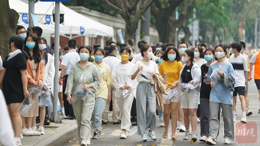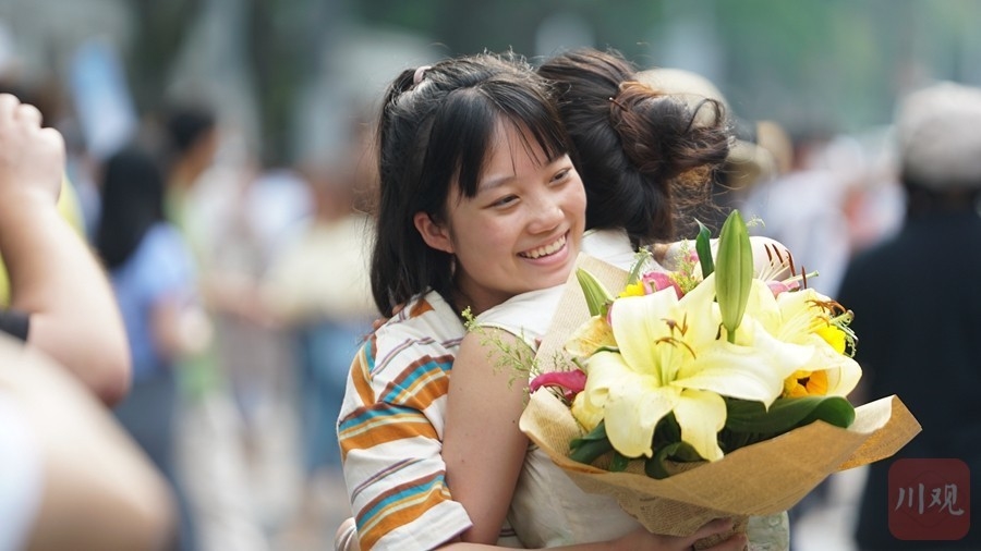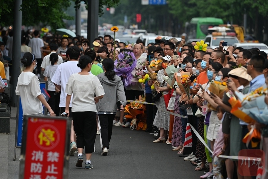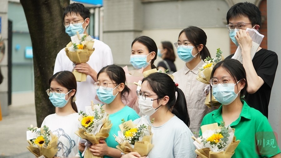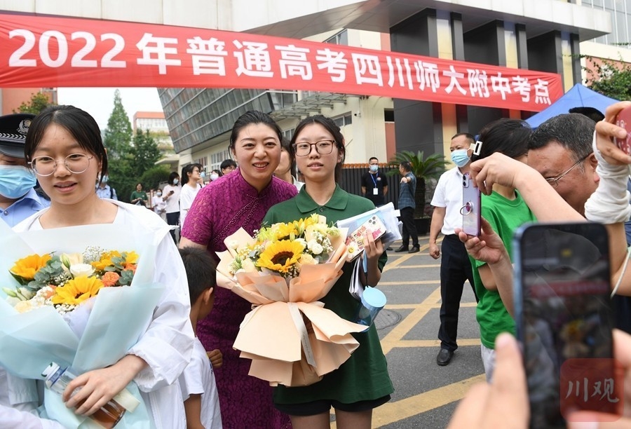6月8日下午5时,伴随着最后一科英语考试结束铃声拉响,2022年普通高考落下帷幕。四川师大附中、盐道街中学、成都市七中林荫校区等考点的考生们面带笑容,轻松走出考场,考点外家长们手拿鲜花迎接考生们走出考场。