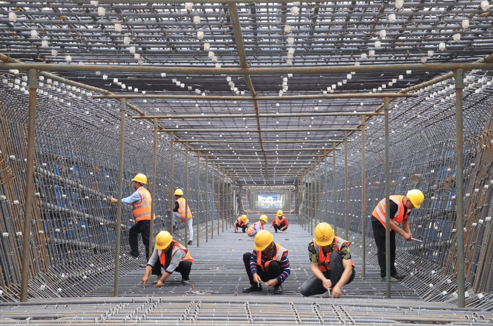 工人们正在绑扎箱梁钢筋笼。许达 摄