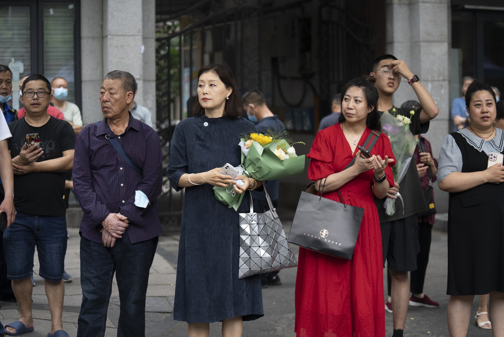 考场外的家长手捧鲜花等待考生