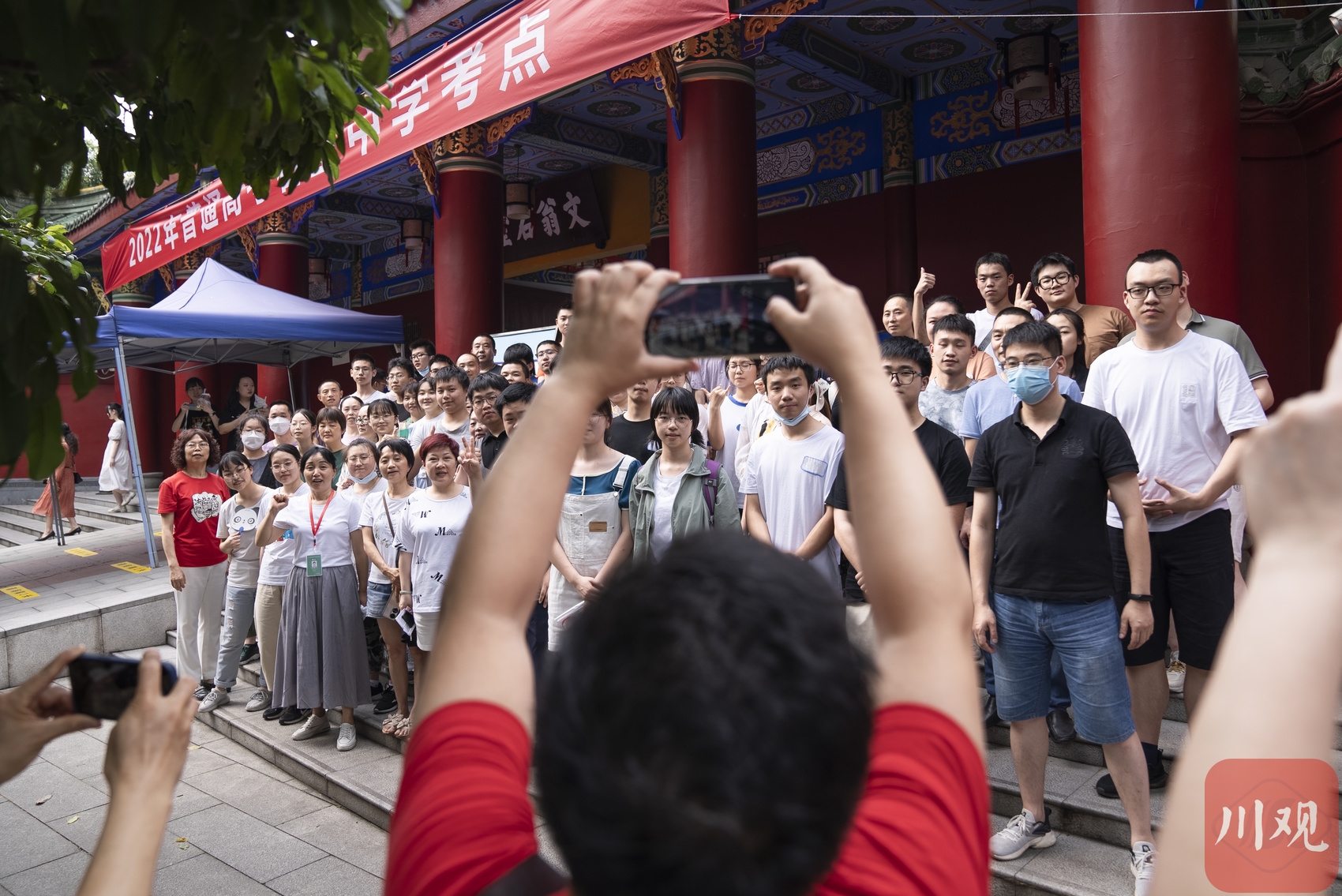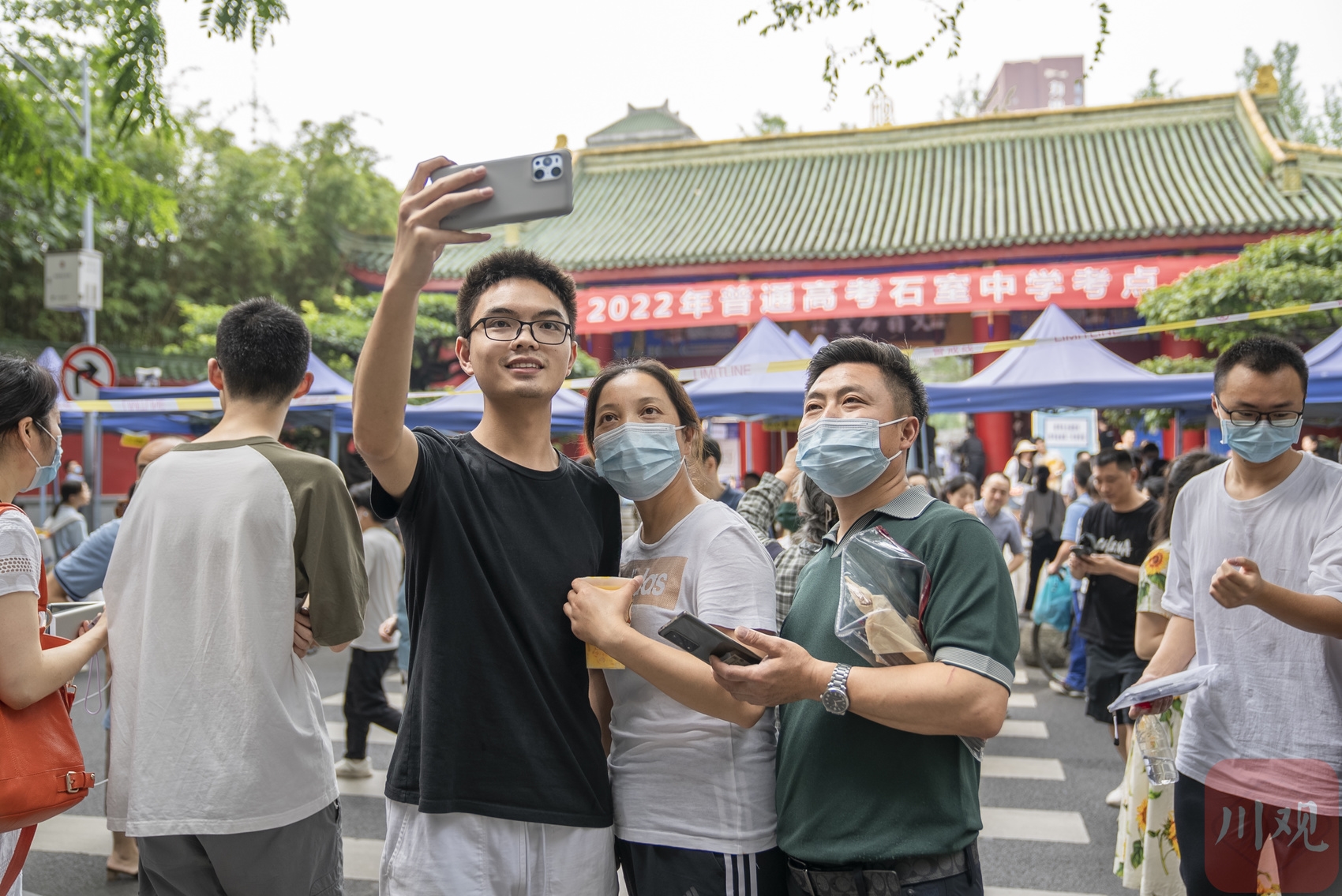 考试结束,考生和家长在考场外合影