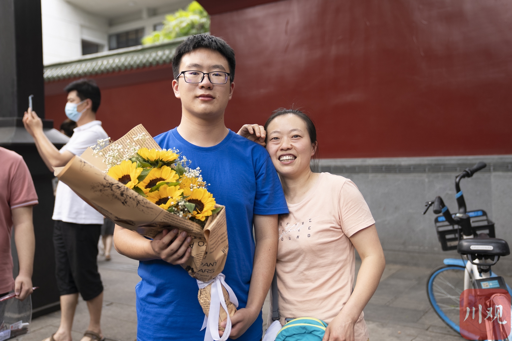 考试结束,考生手捧鲜花和家长在考场外合影