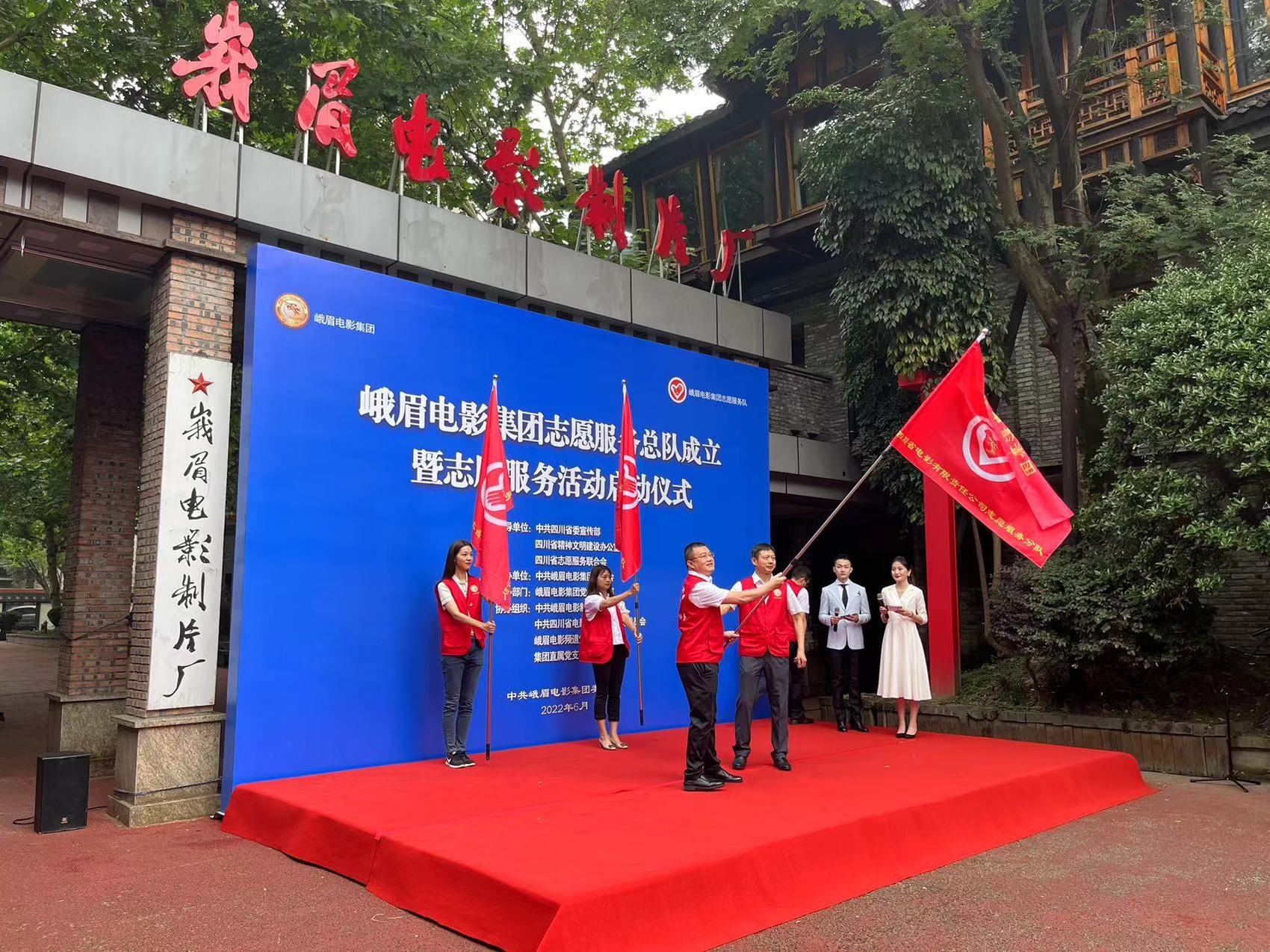 6月9日上午,峨眉电影集团志愿服务总队成立暨志愿服务活动启动仪式在成都“峨影·1958”电影公园举行。省委宣传部相关负责人为峨影集团志愿服务总队授旗,峨影集团党委班子成员为4支志愿服务分队授旗,志愿服务队代表分别做表态发言。