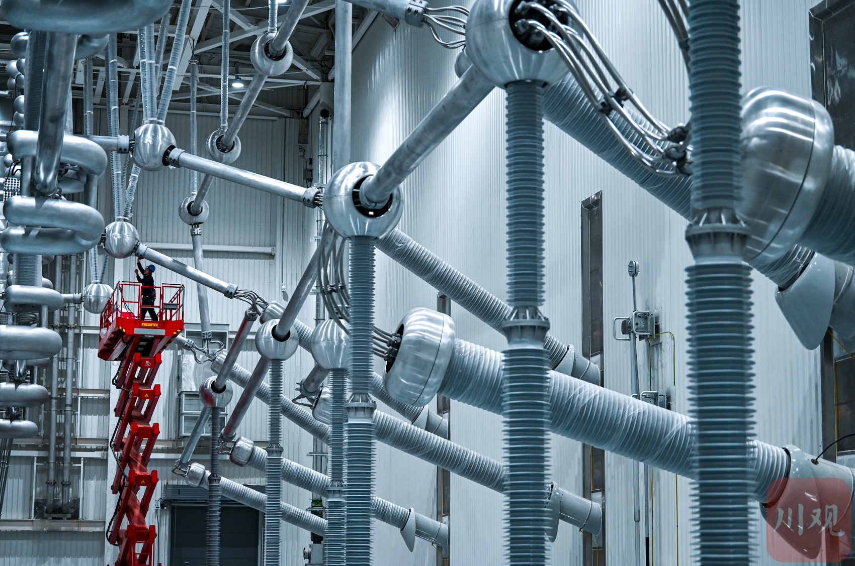 5月6日,技术人员在世界占地面积最大的特高压换流站——±800千伏布拖换流站阀厅内安装设备。