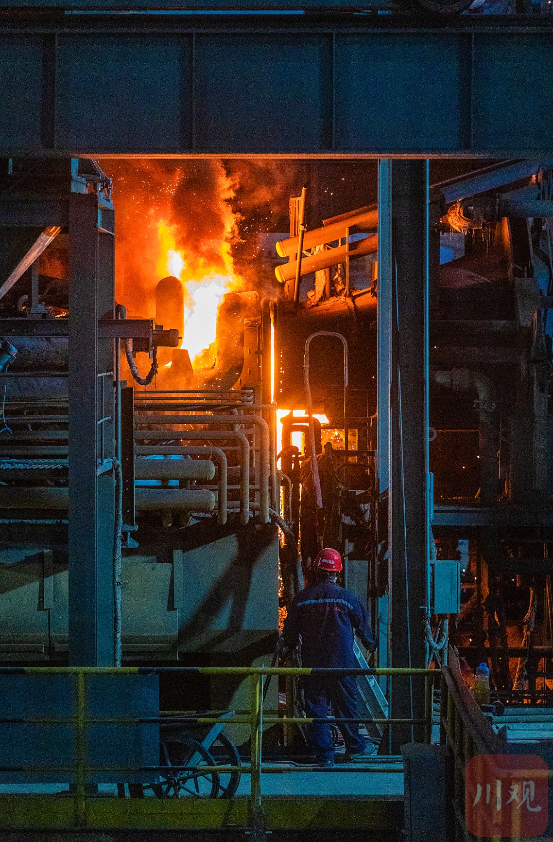 5月27日,泸州鑫阳钢铁公司生产车间里机器轰鸣、钢花飞溅,工人们正忙着生产。