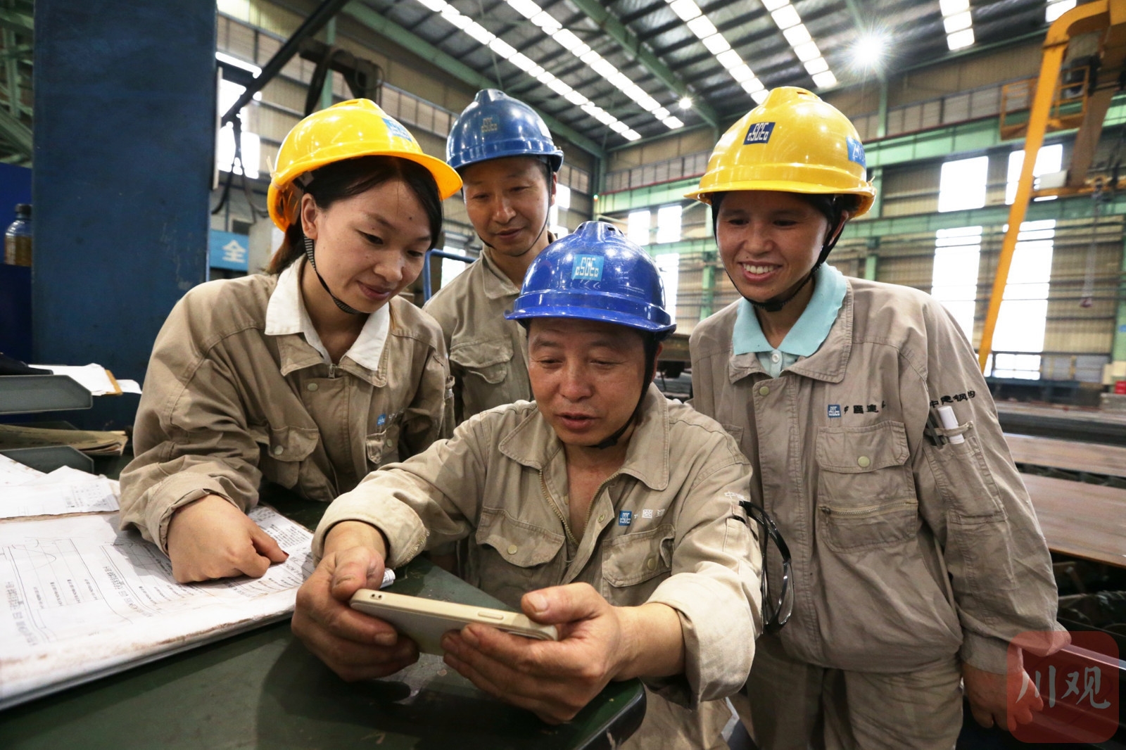 6月9日晚,眉山市中建钢构有限公司的工人在车间收看新闻联播。
