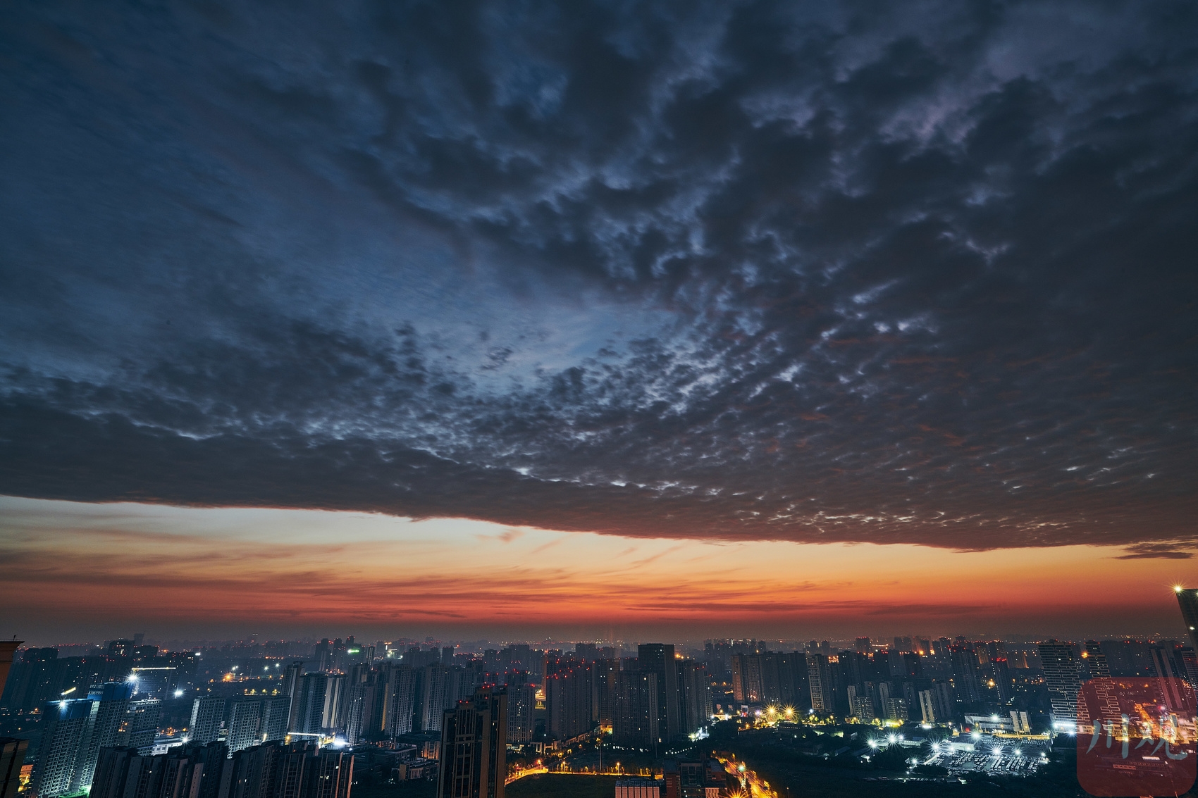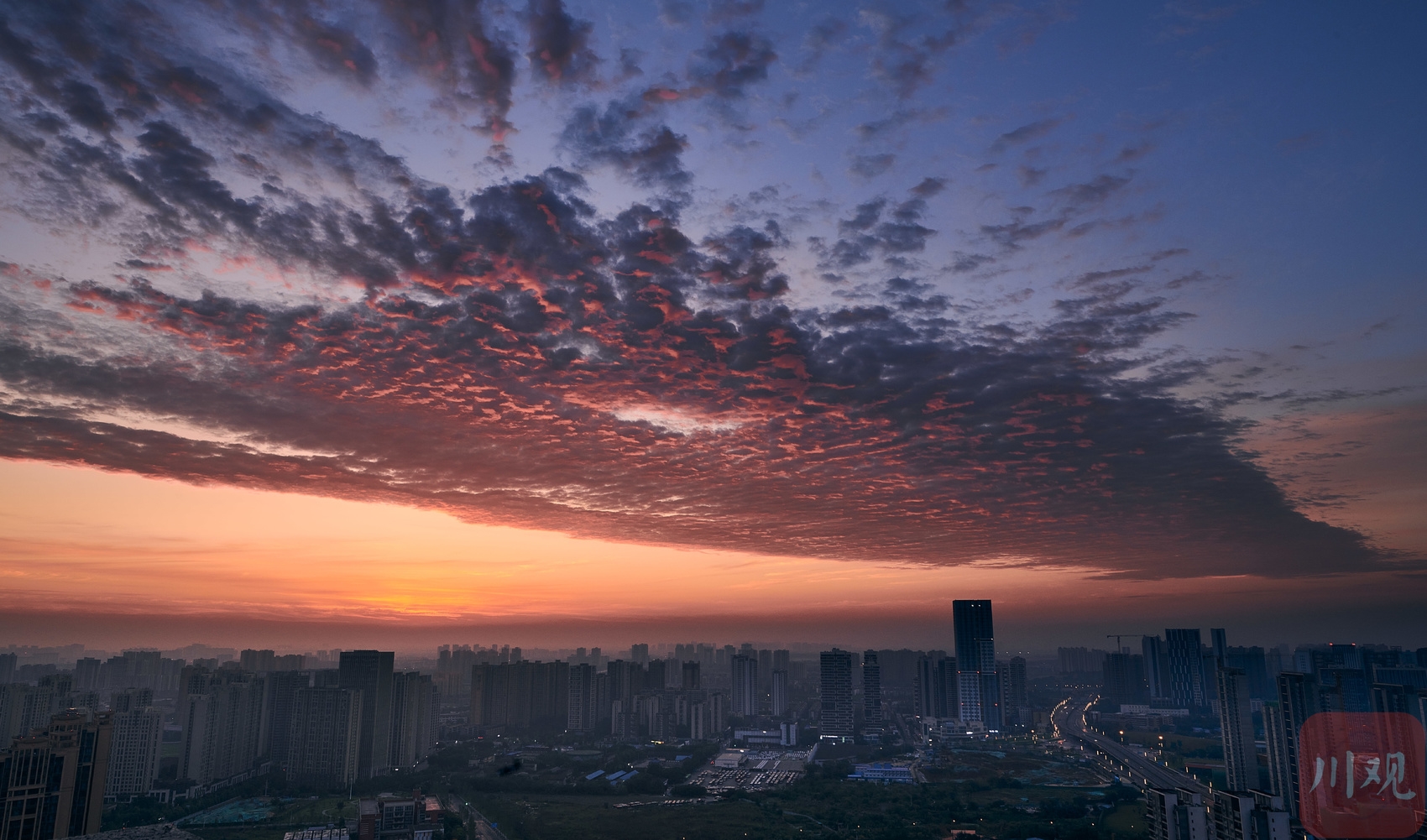 6月14日清晨,成都朝霞满天。红彤彤的天际线勾勒出城市轮廓,布满朝霞的成都天空美轮美奂。