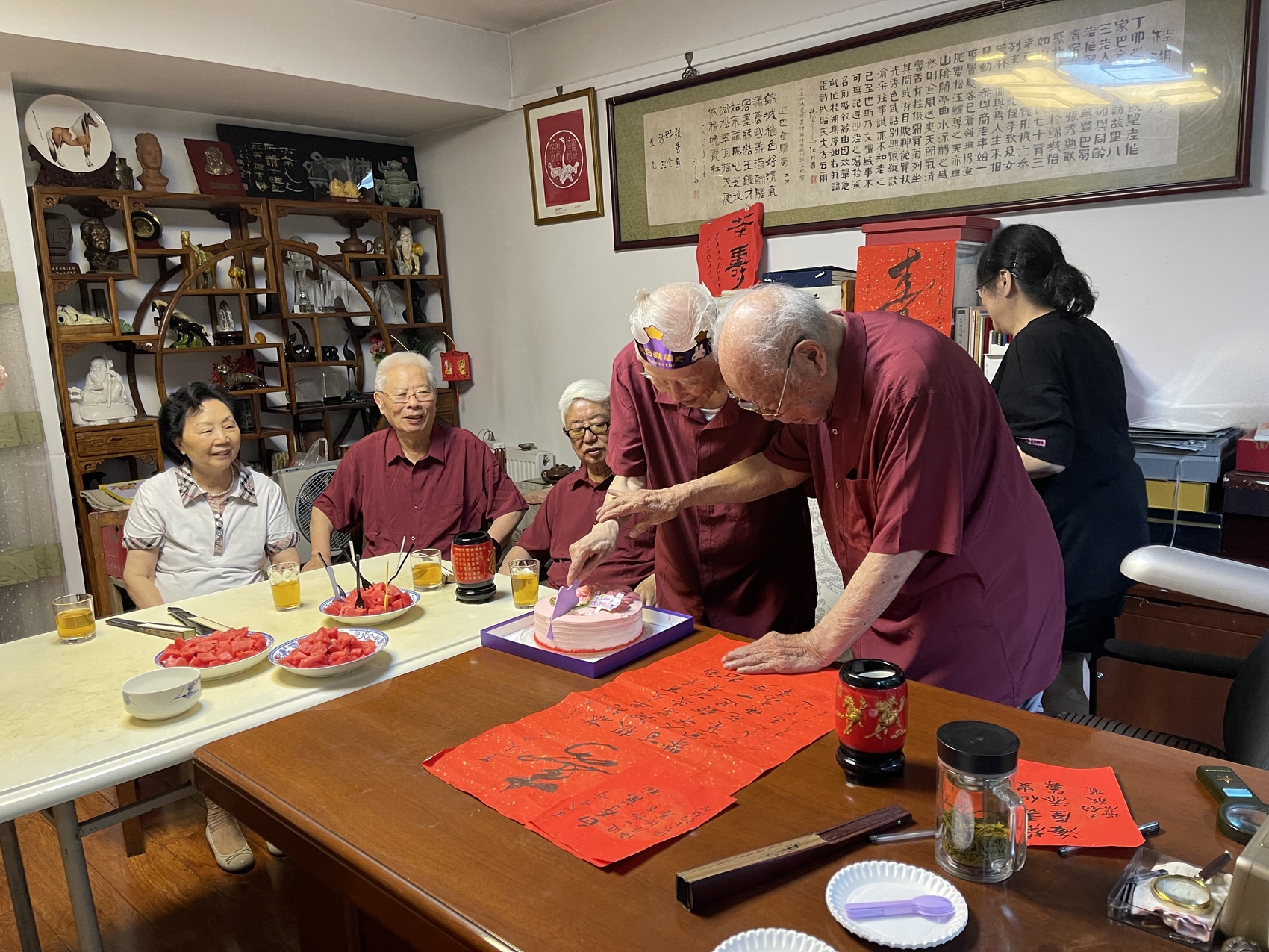 聊了一会儿,大家提议吃生日蛋糕。王老戴上生日帽,马老很自然地握着他的手,两人共同切开了蛋糕,笑得像两个孩子。
