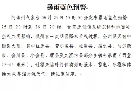 ▲ 阿坝州气象台发布暴雨蓝色预警