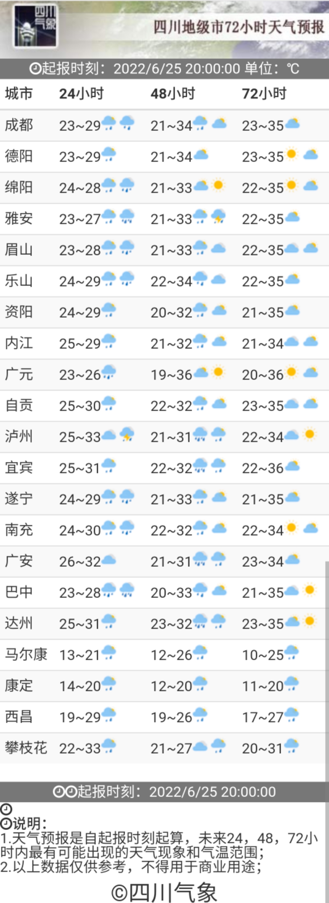 ▲ 巴中市气象台预计:据最新气象资料分析,预计25日夜间至26日夜间巴中将有一次强降雨天气过程,南江县、巴州区、经开区、恩阳区暴雨到大暴雨,过程累计雨量80一120mm;通江县、平昌县暴雨,过程累计雨量50一80mm,个别地方100mm以上。最大小时降雨量30一50mm,过程中伴有雷电、阵性大风、短时强降水等强对流天气,请注意防范此次强降雨可能引发的城镇内涝、局地山洪、中小河流洪水和地质灾害。