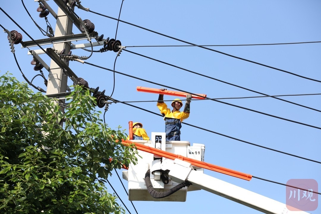 7月6日,为保证高温下电网的安全稳定运行,国网成都供电公司的职工顶着烈日对输电线路开展带电作业。