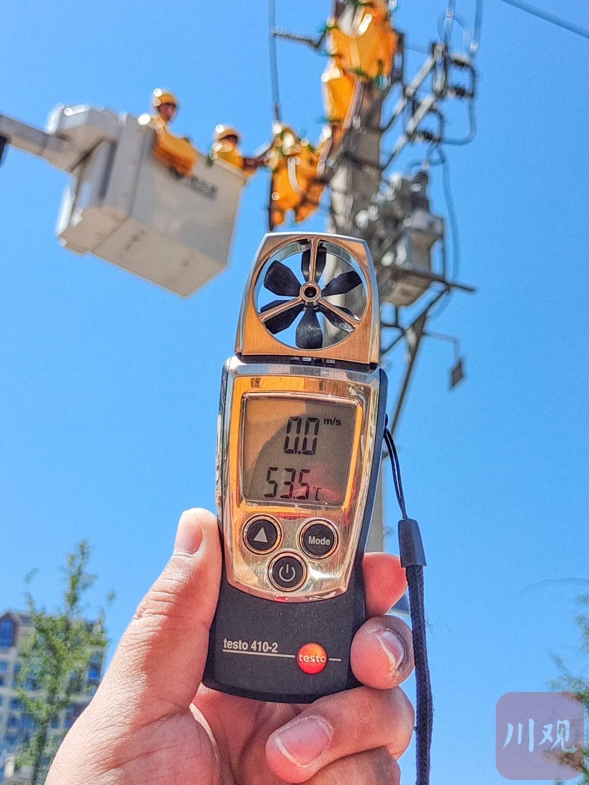 7月6日,国网绵阳供电公司的职工身着绝缘服冒着高温抢修隐患线路。此刻地表温度已达53度。