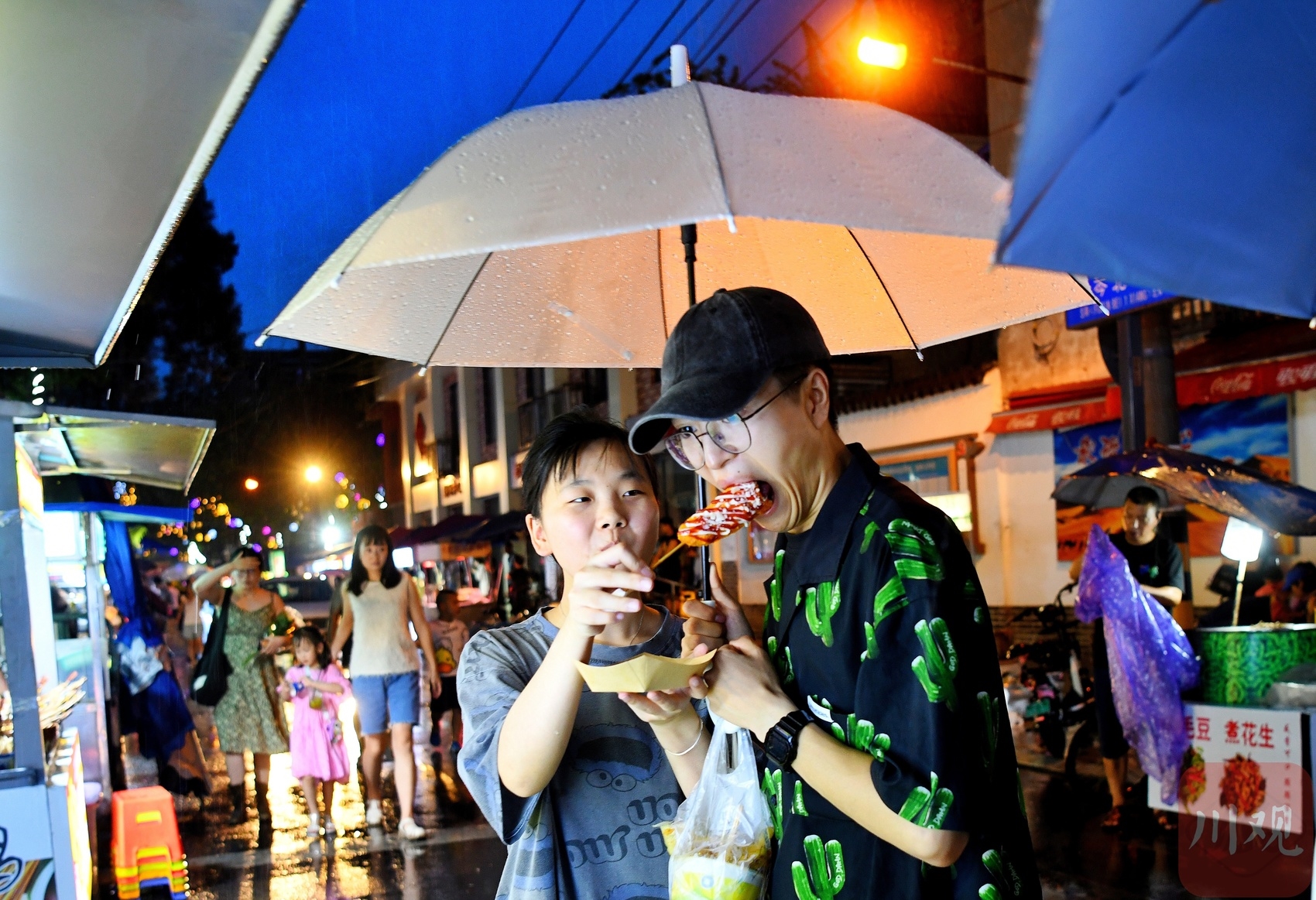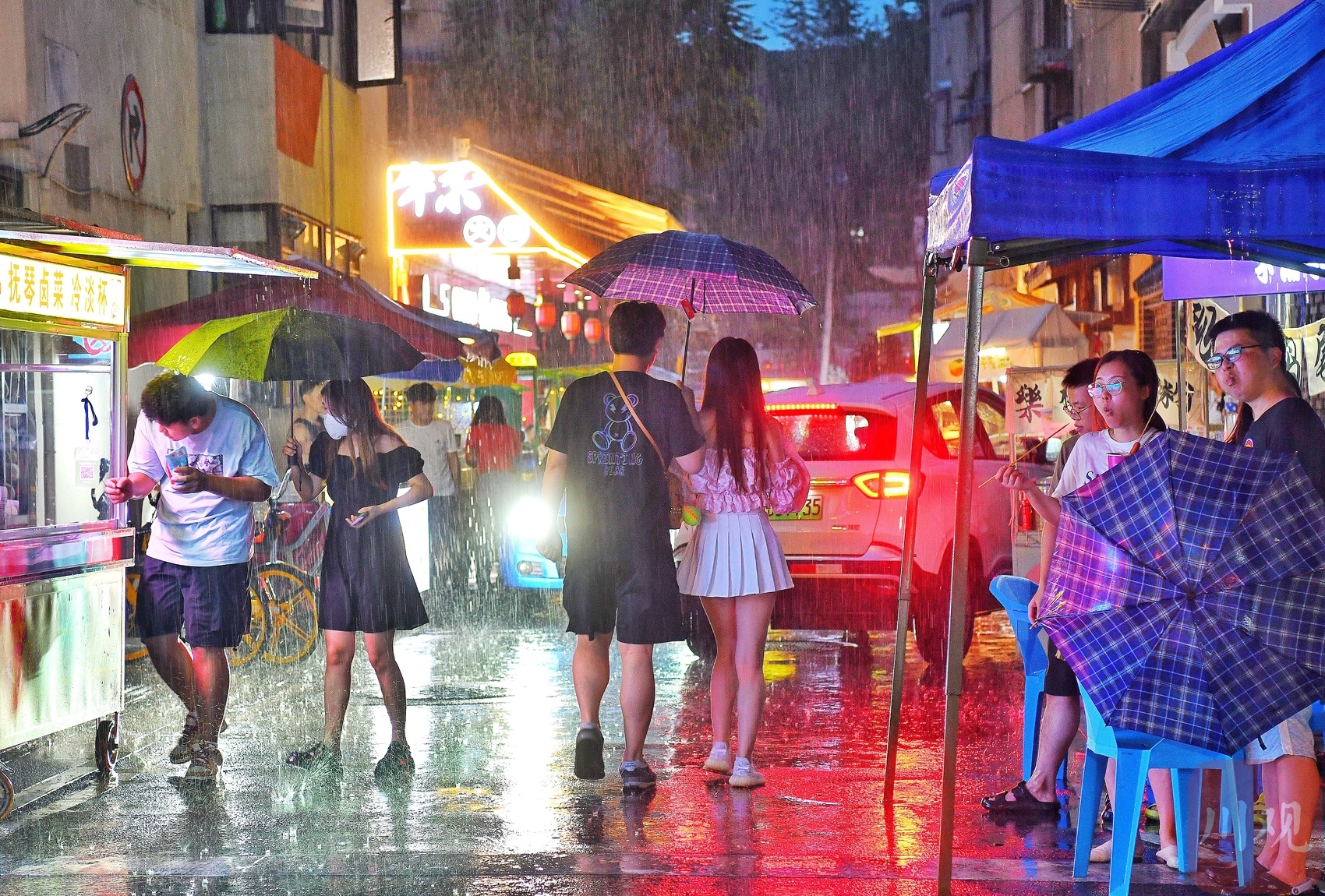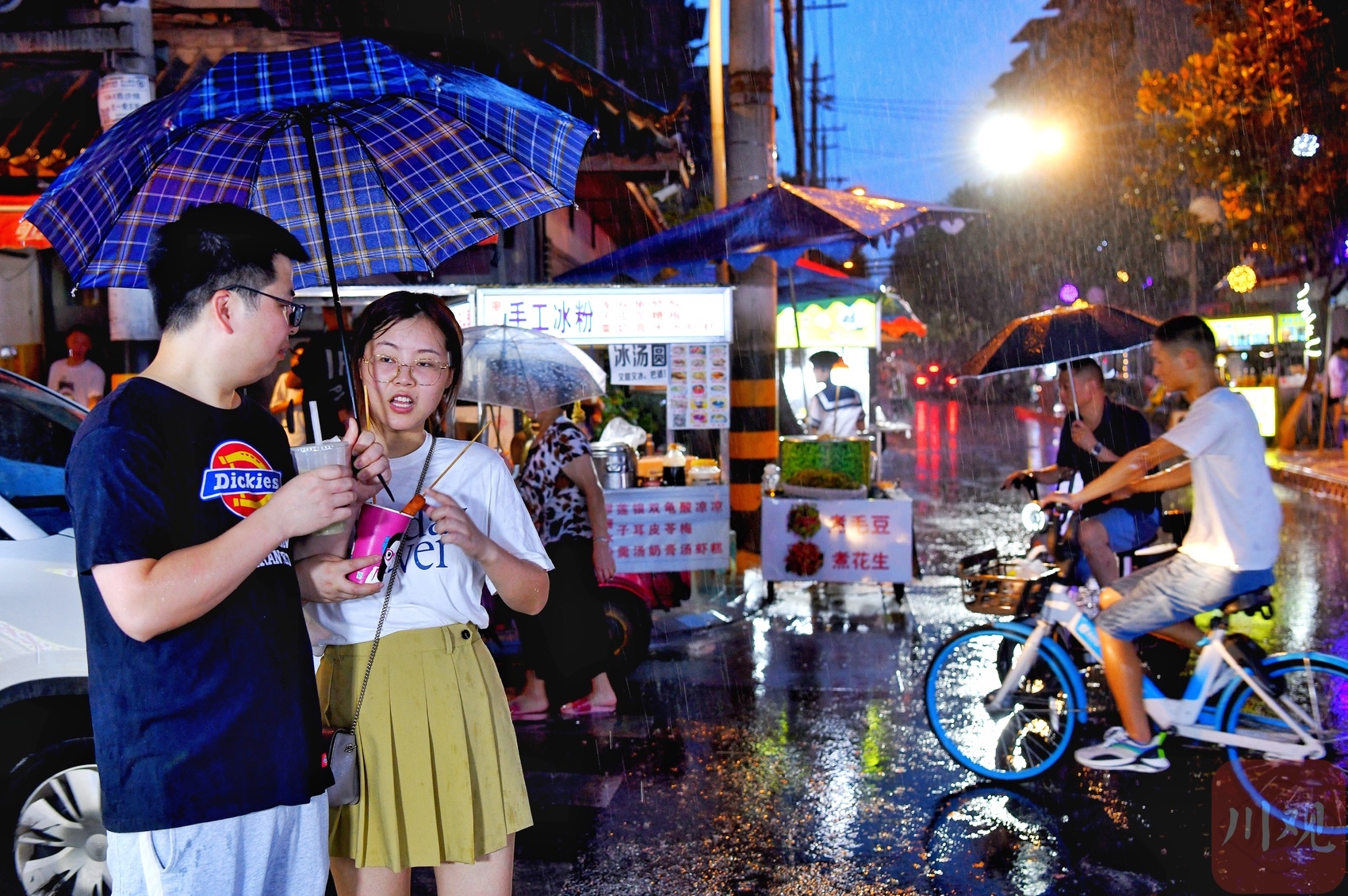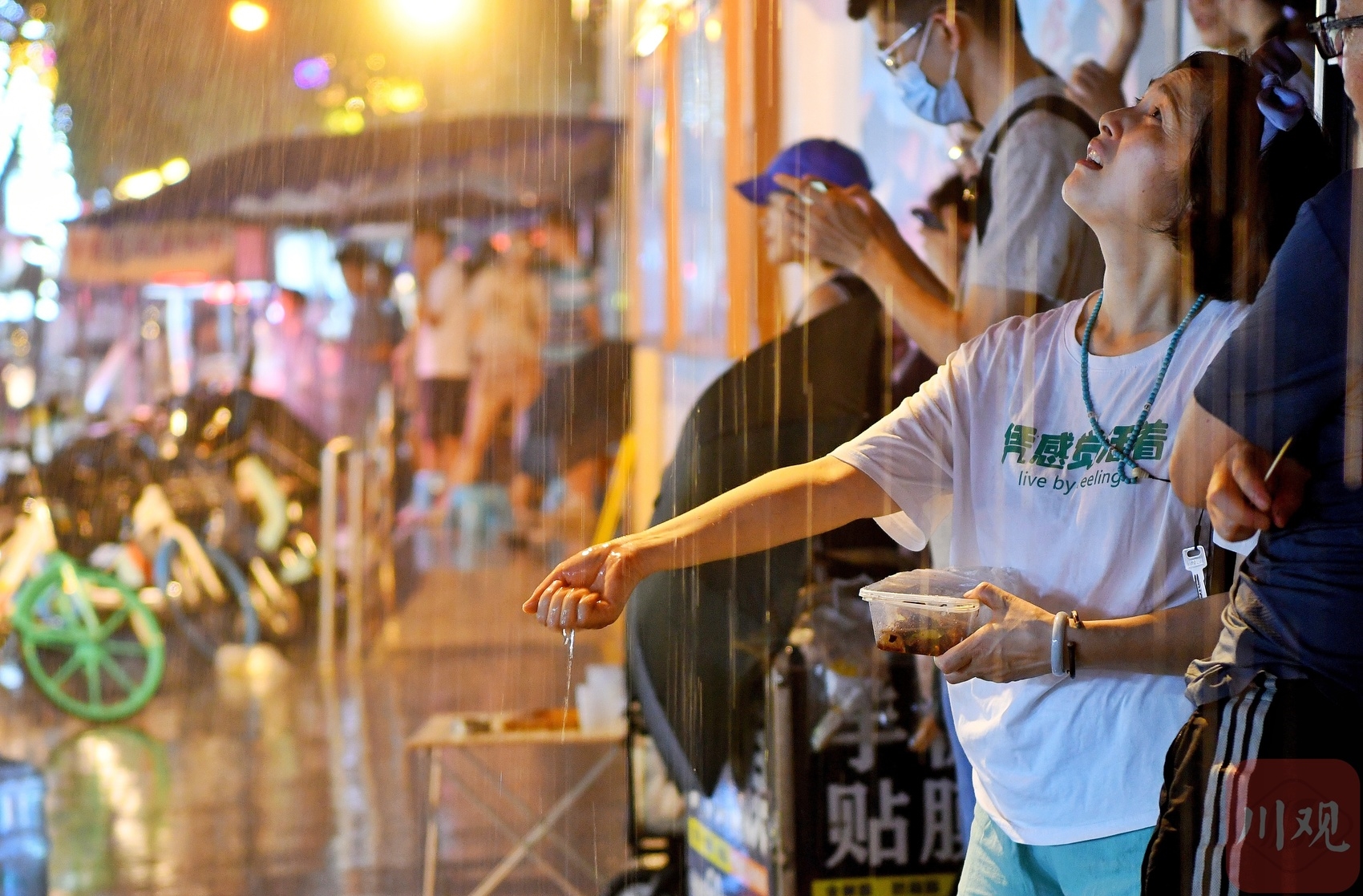 在抚琴路美食夜市,随着雨势的加大,小街小巷里有遮雨棚的各式烧烤摊点,小桌小凳挤满了宵夜的人群,“这场雨下得好,终于有点凉意了。”“老板!再烤点五花肉,要麻辣味。”不论是汇聚在各美食摊的食客,还是撑伞在雨中漫步的行人,在这场夜晚中的雨中即景里,每一个人都显得不慌不忙,哪怕雨点打落身上,也依然从容自如。“来份毛豆,煮花生也来一份。”“小心车来了!”雨水淋到手上是温的,也有说不出的安逸。