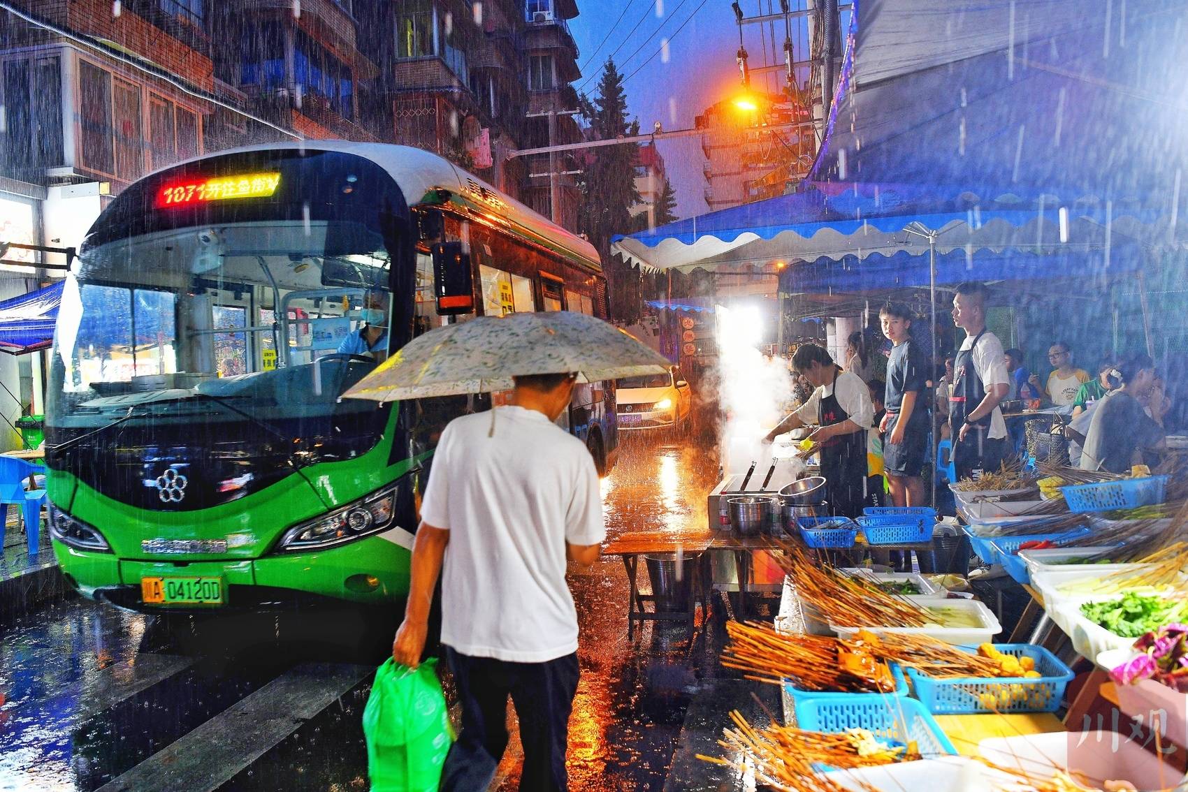 暴雨中的抚琴路美食街依然烟雾缭绕,丝毫没有消减它的烟火气。据天气预报显示,未来一周内,成都市区还会降雨,持续闷热的高温天气也许会得到一定缓解。