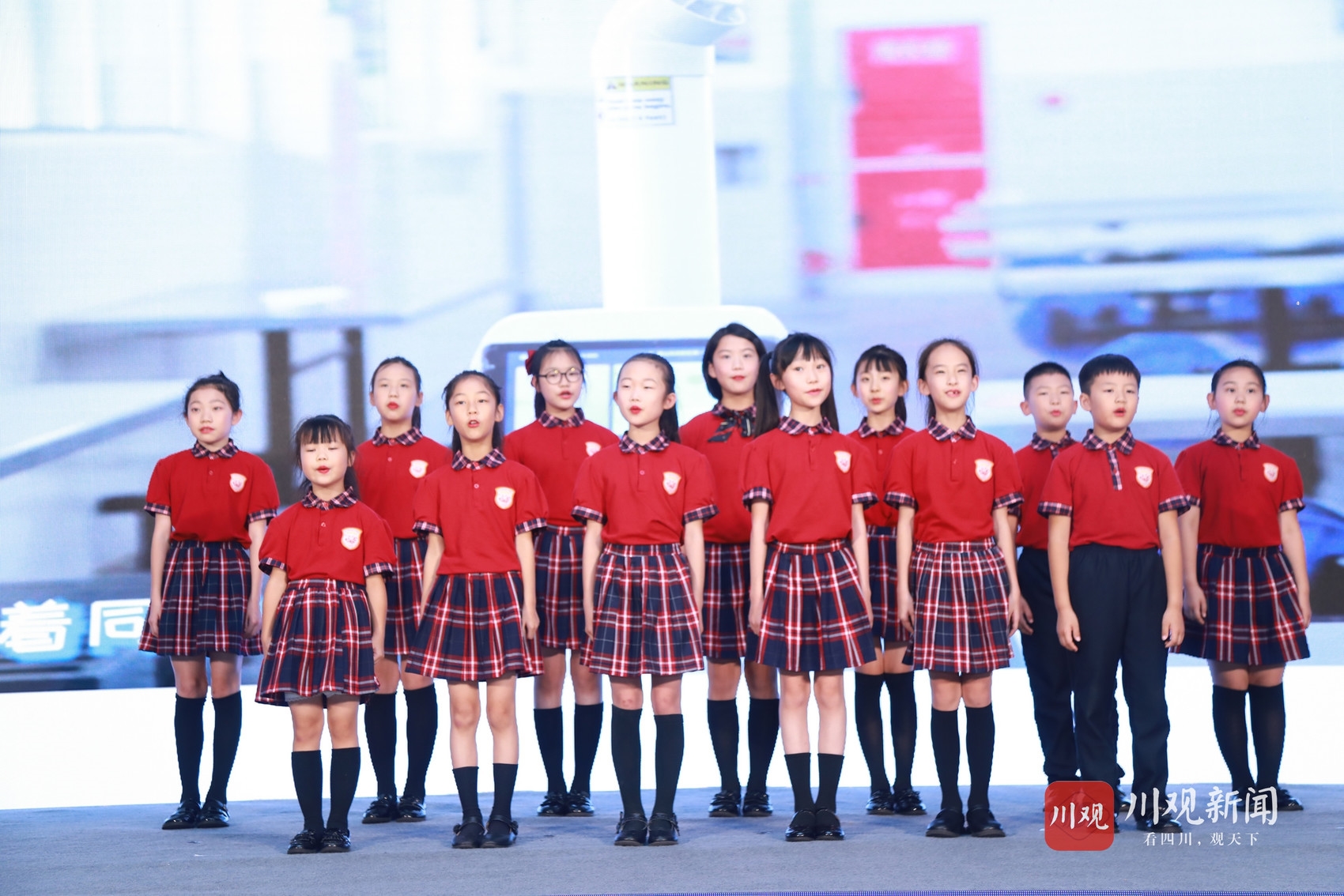2022四川校园食品安全论坛现场,四川国际童声合唱团演绎国家食品安全宣传歌曲《蓝蓝的梦》。