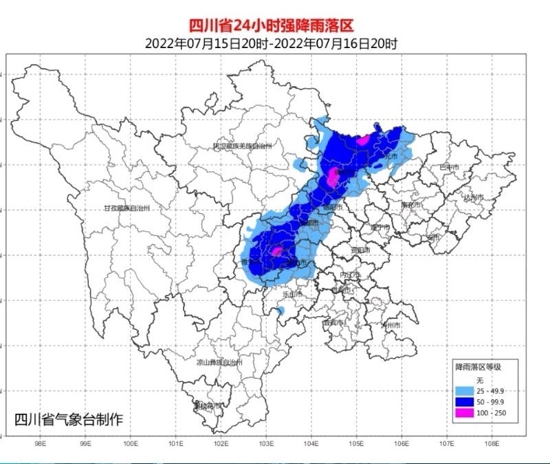 从省气象台发布的“24小时(7月15日20时—16日20时)强降雨落区图”上可以看出,此次降雨的范围——广元、绵阳、德阳、成都、眉山、雅安北部和乐山西北部,这条雨带跟前期降雨落区高度重合。