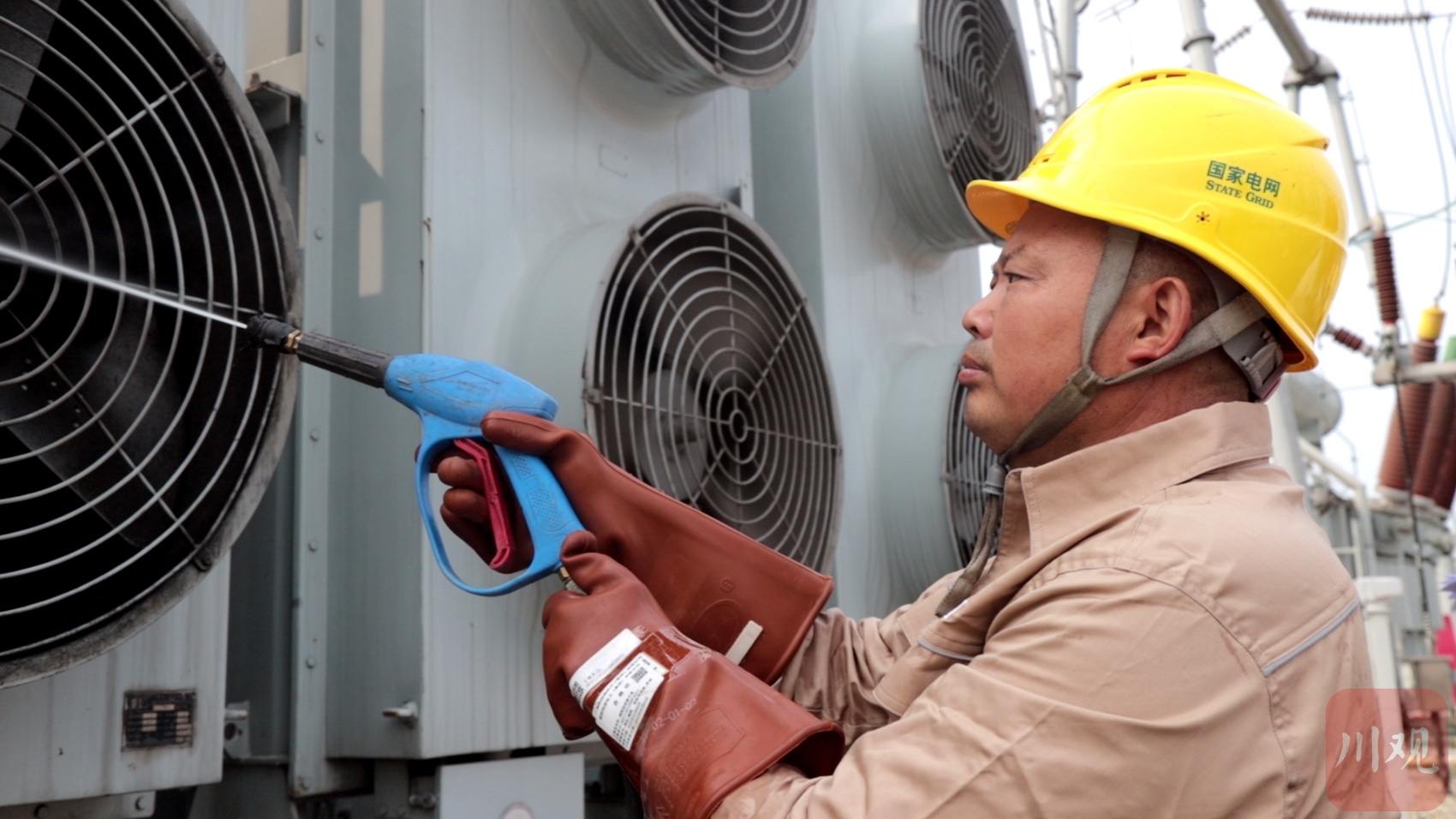 秋月变电站是承担德阳主城区、附近园区企业供电的核心变电站之一。烈日下,电力工人分组对主变压器进行测温、“洗澡”降温。“当前开展的工作是利用高压水炮对散热器片进行冲洗,一方面可以利用冷水对主变本体进行物理降温;另一方面冲洗散热器片上的积灰也能进一步提高热量交换效率。”德阳供电公司变电运维工作人员杨刘欣说。