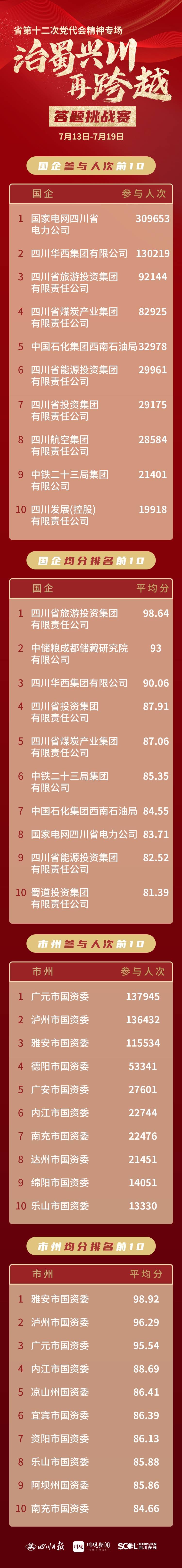 7月19日,“治蜀兴川再跨越”省第十二次党代会精神专场答题挑战赛继续放榜,截至目前答题人次突破153万人次,覆盖全省21个市州,105家国企单位,累计阅读量达468万人次!