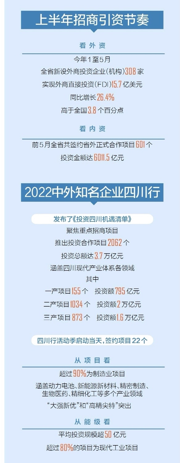 关键时刻,四川抓住重要机遇。7月15日,2022中外知名企业四川行活动季顺利启动,110余家央属国企、“三类500强”企业、知名跨国公司、行业龙头企业、专精特新企业和知名商协会参会。新签约项目22个、平均投资规模超50亿元。发布《投资四川机遇清单》,面向全球一口气推出投资合作项目2062个,涉及投资额高达3.7万亿元。“抢抓机遇,合作共赢”成为中外客商提及最多的一句话。