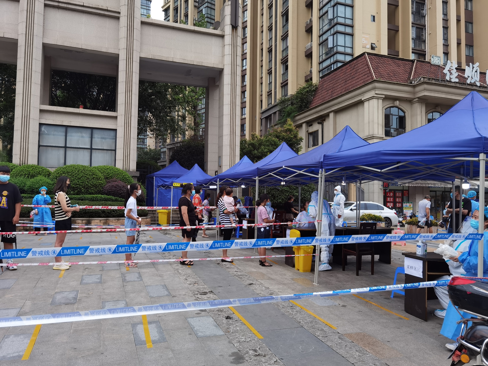 7月19日,眉山市东坡区派克蜜城小区门口,市民有序排队做核酸。谢晓龙 摄