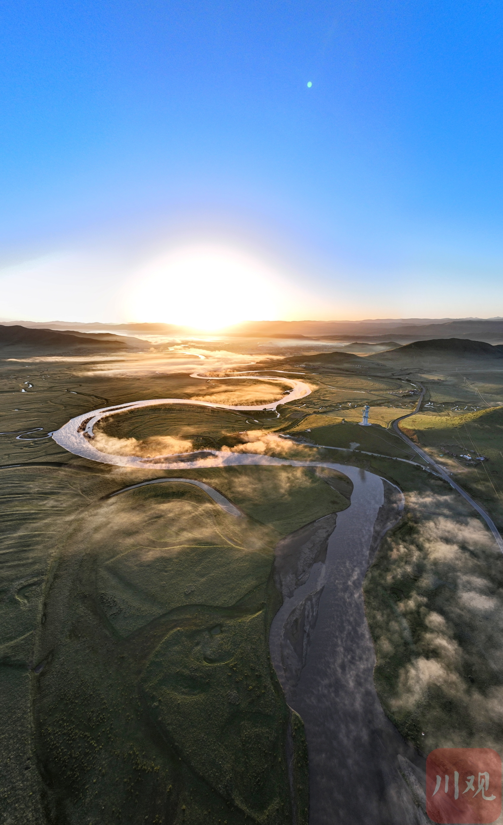 清晨5时30分许,红原县大草原上一片宁静,站在山顶眺望,月亮湾景区被淡淡的薄雾包围、群峰环绕起伏、草原就像柔软的绿毯,铺在梦幻的大地上。太阳升起,蜿蜒的河流穿越草原,金色阳光下的一切都宛如一幅“诗画天堂”。