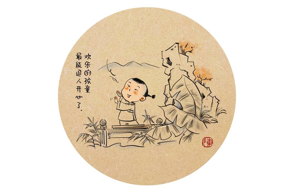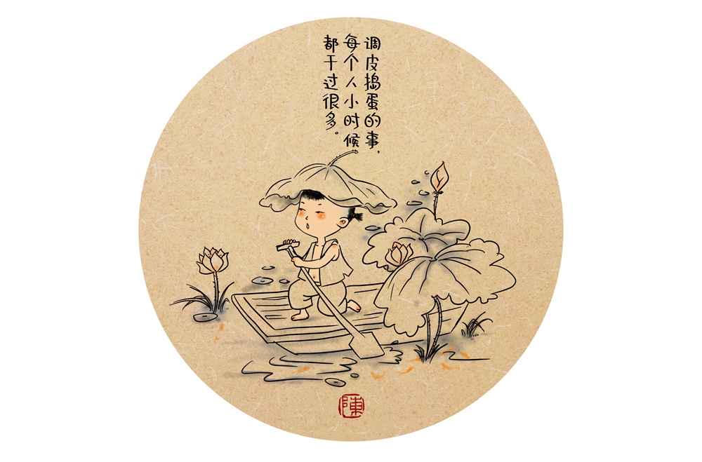 译文:一个头发蓬乱、面孔青嫩的小孩在河边学钓鱼,侧身坐在青苔上绿草遮映着他的身影。
