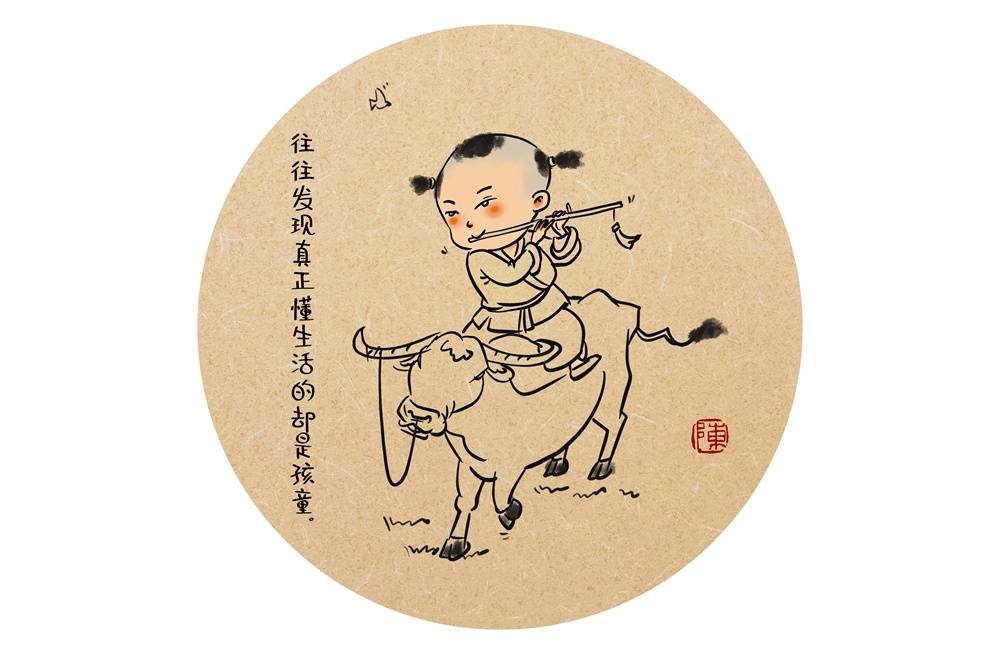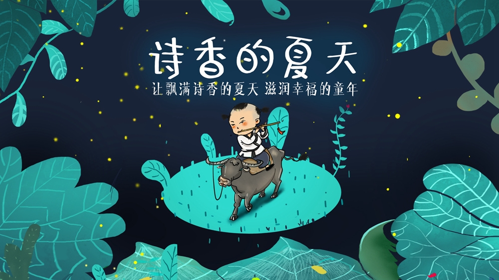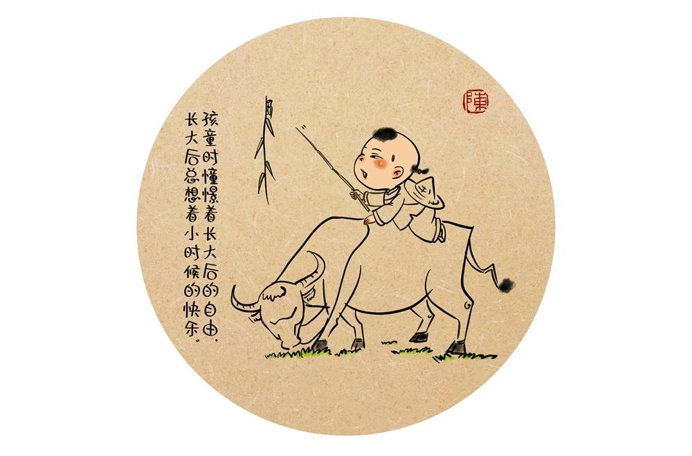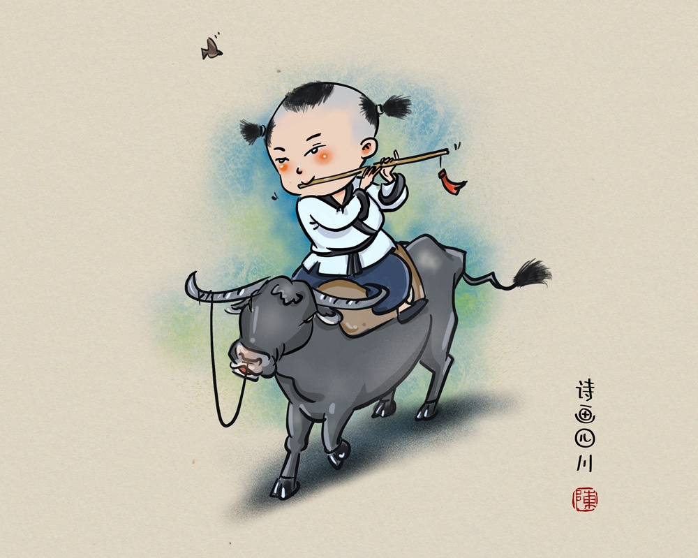 译文:牧童骑在黄牛背上,嘹亮的歌声在树林中回荡。忽然想要捕捉树上鸣叫的知了,他就马上停止唱歌,一声不响地站立在树下。